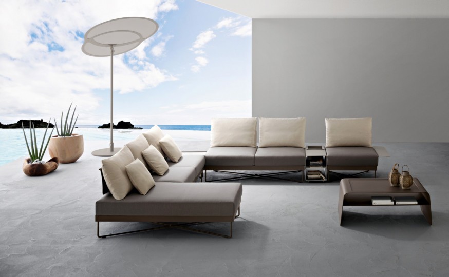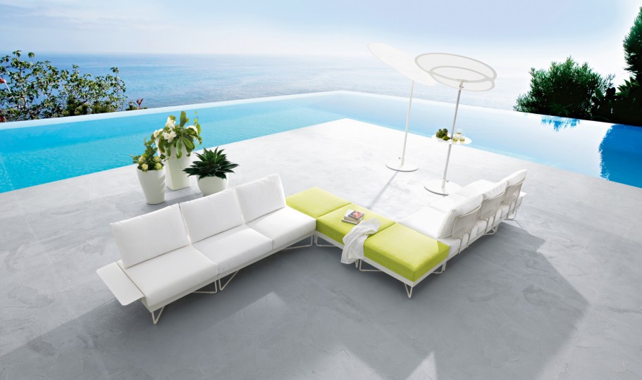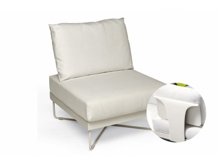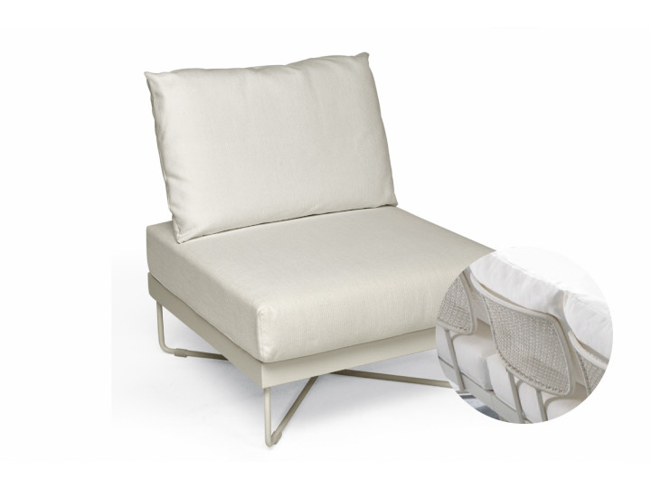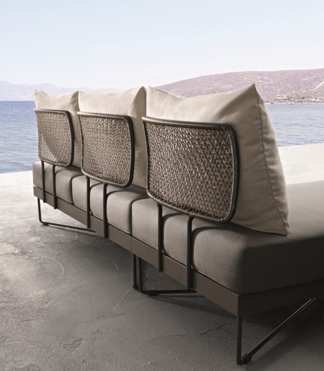 Outdoor Element 1 seat, aluminum seat,stainless steel frame, back woven with Oval Sunloom. The whole line is modular, its basic design allows to match the various elements in harmony. The woven back gives a richer and elaborate style to the element, a stronger identity. Suitable for terraces, patios, pool areas and lobby for contract projects.