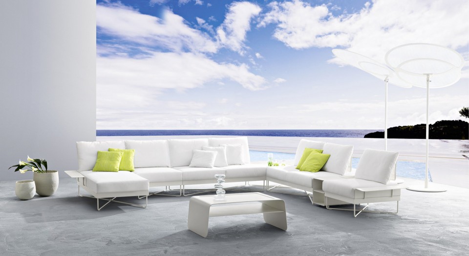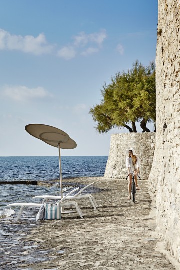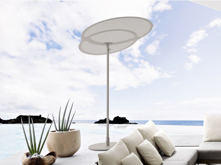 Oval sunshade with Batyline, metal coloured frame. The main feature of this product is given by the sunshade element that is adjustable both vertically and horizontally, ensuring in this way a perfect shade. The Coral Reef parasol is perfect for the pool furnishing in home and contract projects.
