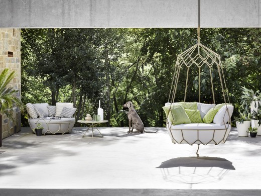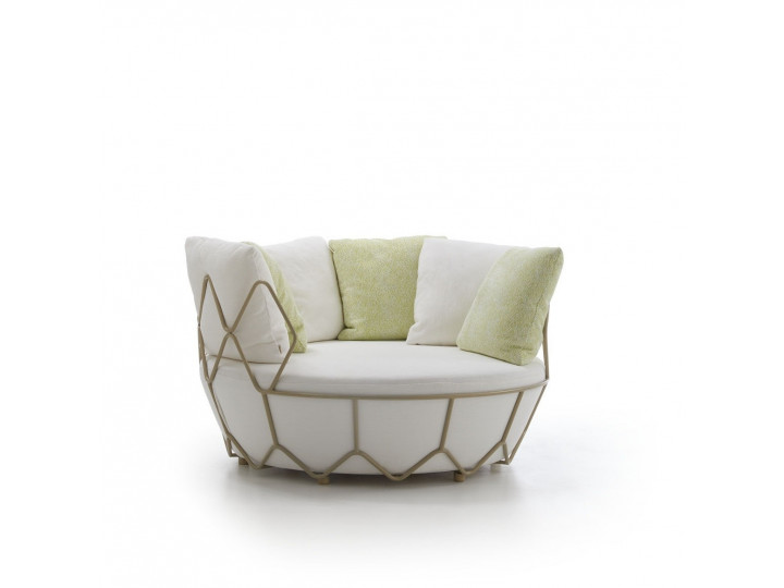 Outdoor sofa, stainless steel powder coated. Its shape, soft and crooked, and its comfortable and cozy seat, inspire cuddles and hospitality, giving a general sensation of relax and quiteness to the surrounding space. Perfect for both outdoor and indoor furnishing of home and contract projects.