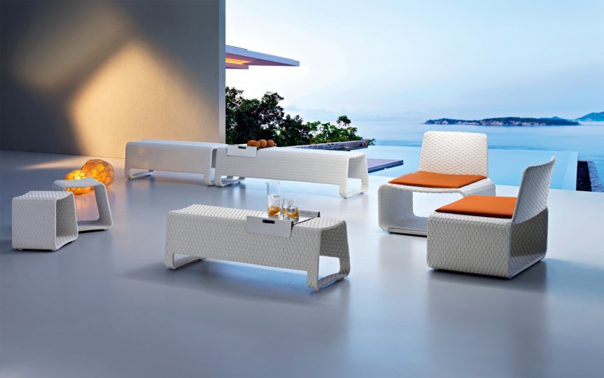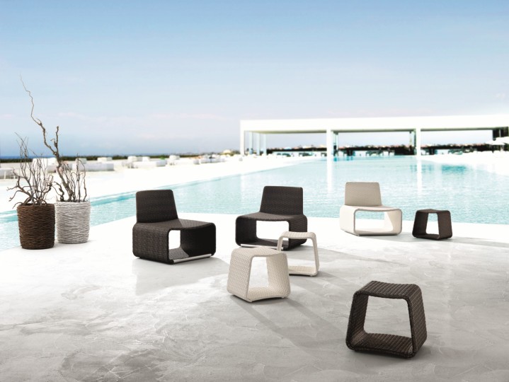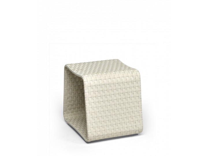 Outdoor Pouf, aluminum woven with Sunweave. It is a versatile element that may be used also as an occasional table or a footrest. Its basic shape allows to combine it easily in the pool areas, terraces and also indoor areas. Perfect both for home and contract projects.