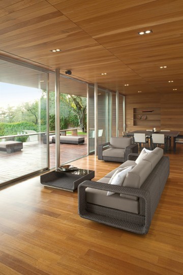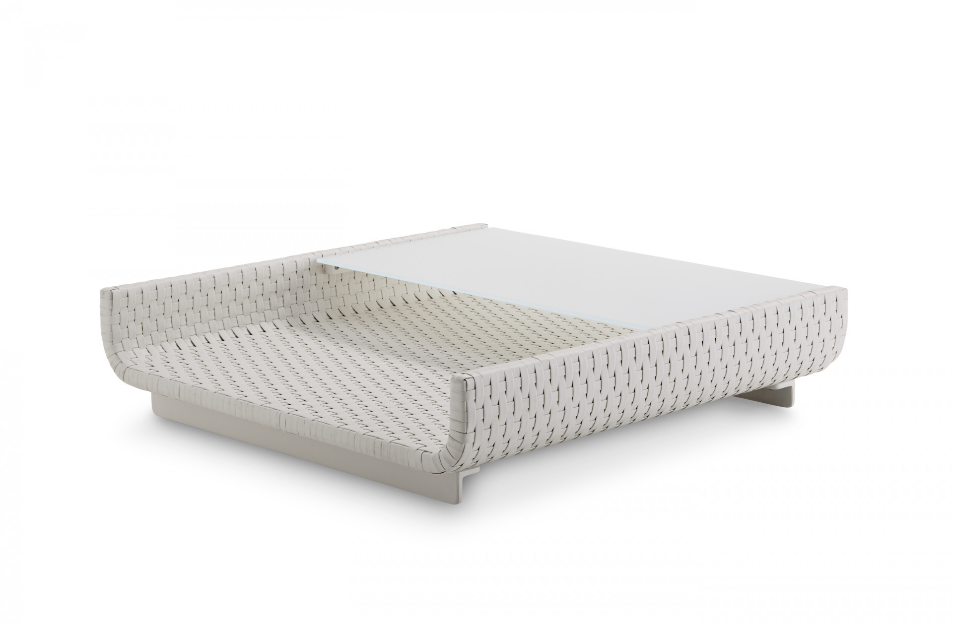 Outdoor Coffee table, aluminum frame and sunweave with glass top. Unique of its kind, the Hamptons Coffee Table gives an exclusive style to the whole composition. The refined glass top contrasts with the strong identity of the woven base. It’s a design element perfect for furnishing patio and terraces but also indoor living areas.