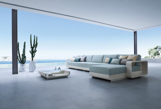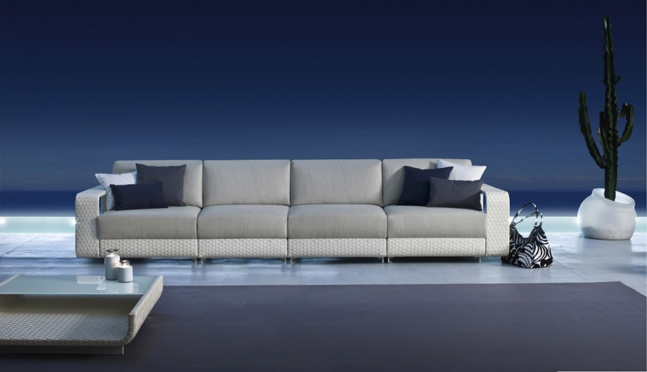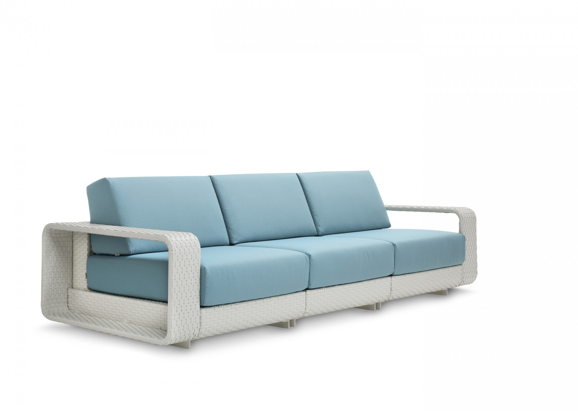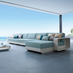 Outdoor Sofa, aluminum frame and Sunweave. This collection is modular and allows to play with the various elements. You may create sofas with several seats, with or without lounge, with or without armrest. Sofas are perfect for furnishing terraces and verandas, in home and contract projects.