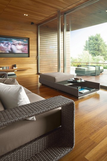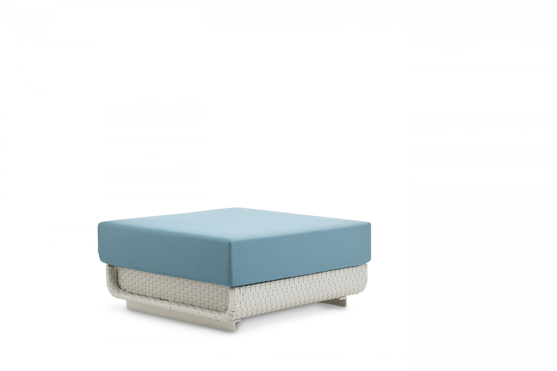 Outdoor Pouf, aluminum and Sunweave. Dynamic and versatile, this pouf may become also a comfortable coffee table or an elegant footrest. Excellent for indoor and outdoor furnishing, both for home and contract projects.