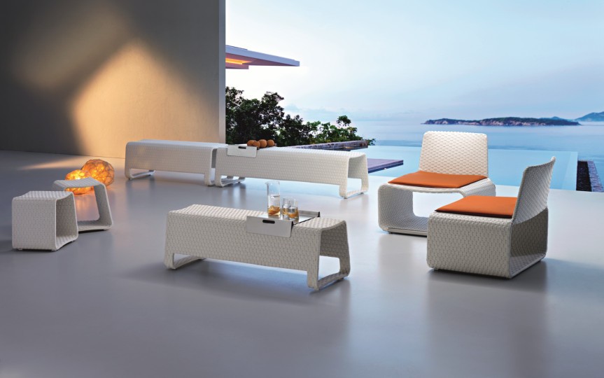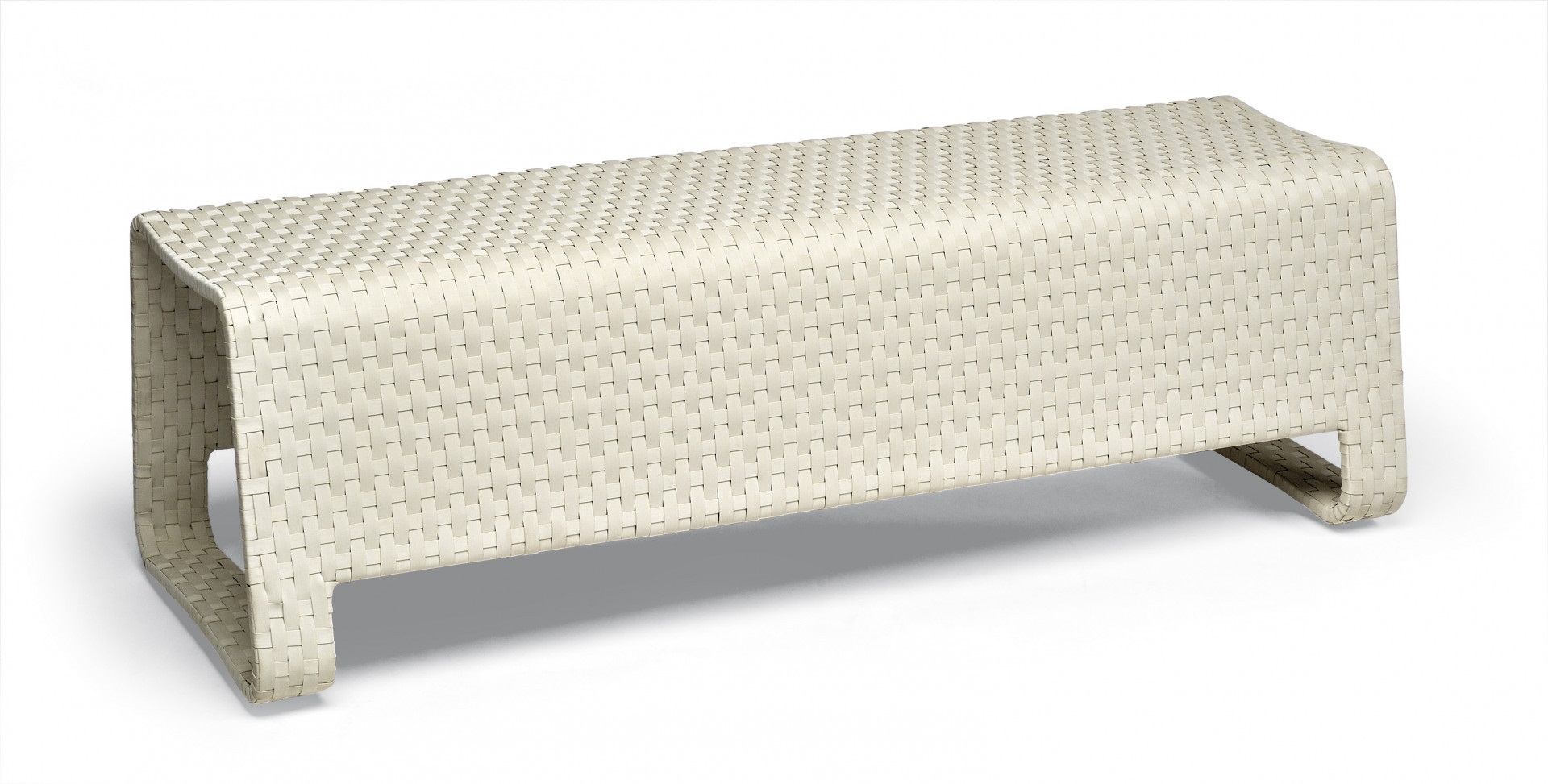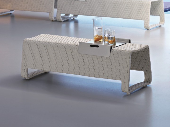 Outdoor bench, aluminum woven with Sunweave. Versatile and dynamic bench, it may be used also as a small table or to divide into several areas a common space.ITs practicality is what makes it a basic complements in the pool areas and the open spaces such as terraces and patios. Excellent for both home and contract furnishing.