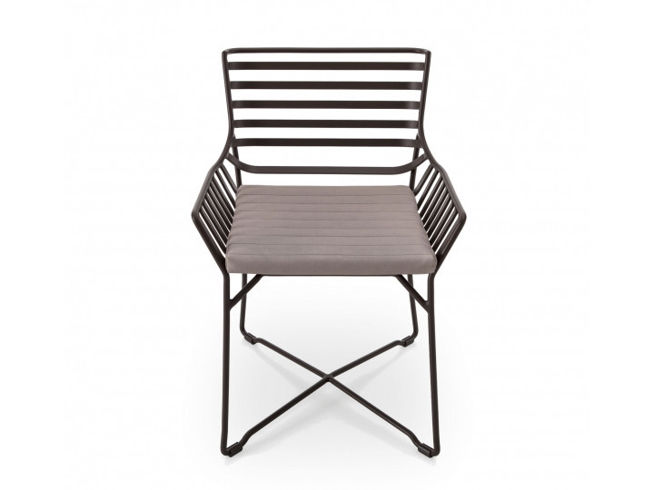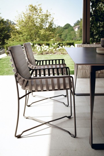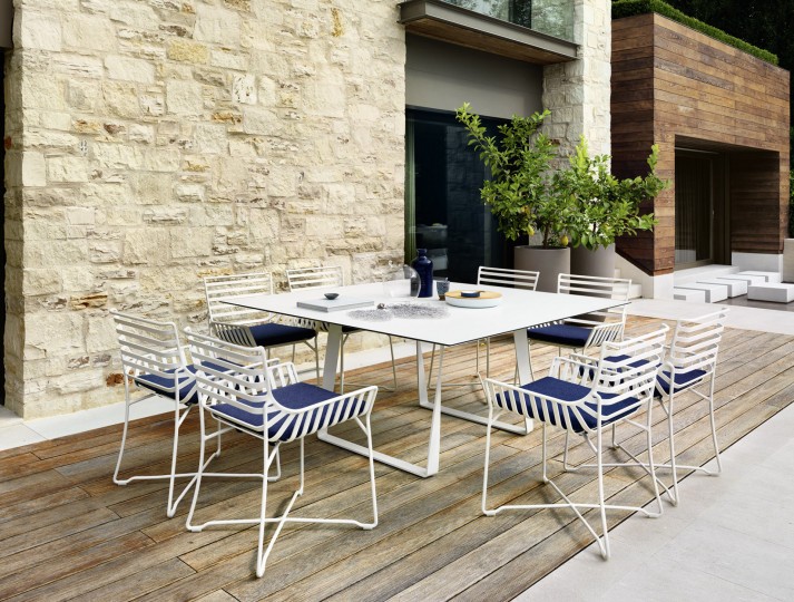 Outdoor chair, aluminum frame powder treated. A chair with a design basic though sophisticate, enriched with the special working of aluminum. The wide and comfortable seat gives a versatile aspect that allows to play with combinations. Hampton Graphics is an outdoor chair perfect for both home and contract furnishing projects.