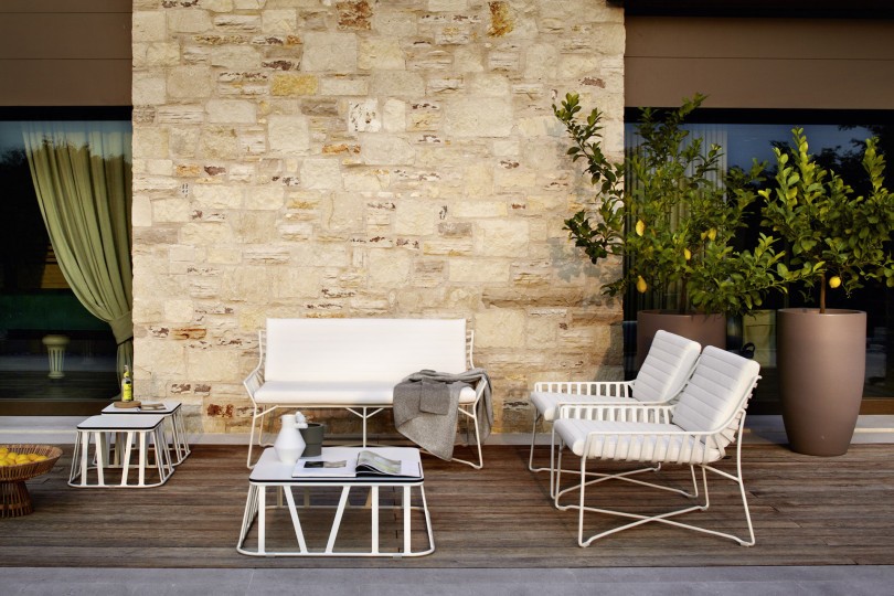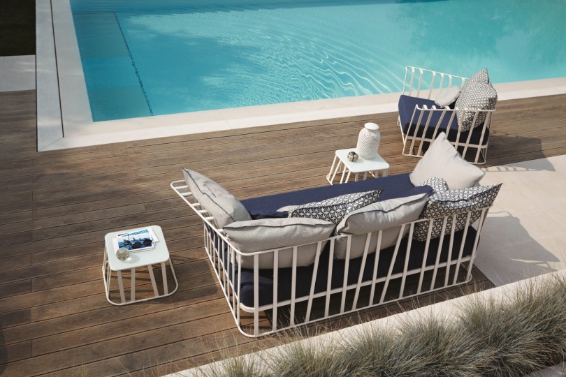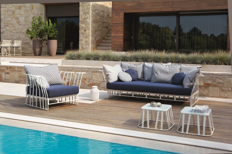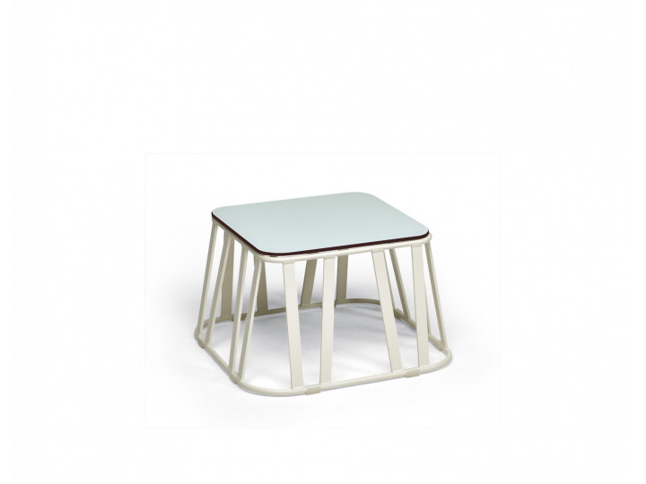 Outdoor side table, aluminum frame powder treated with glass top. The irregular base of the frame, given by the discontinuity of the aluminum axis, contrasts with the elegant top made with glass, in a wonderful optic effect. Perfect for terraces and verandas as well as for living areas, and for furnishing both home and contract projects.