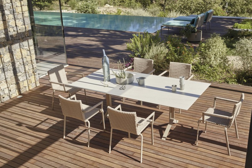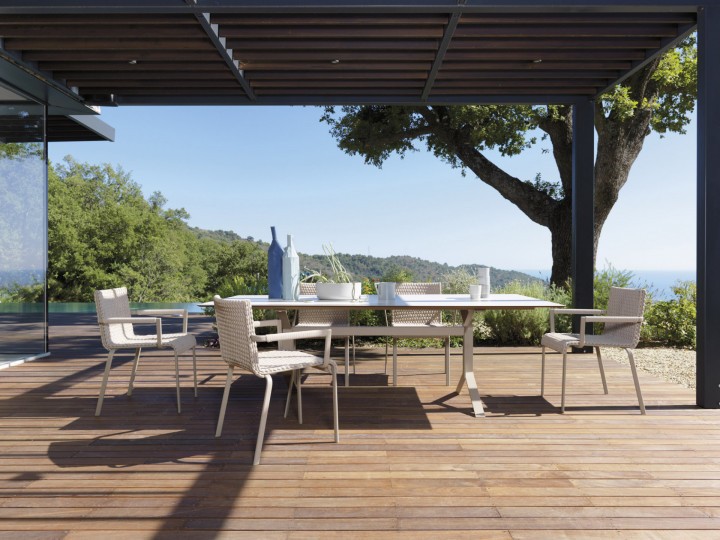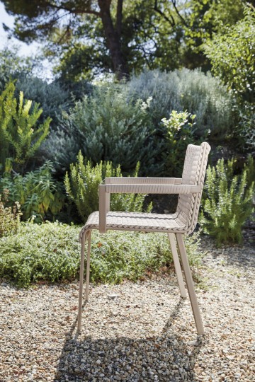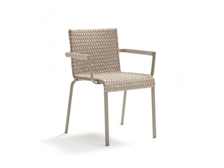 Outdoor chair with armrests, aluminum frame powder coated, woven with sunrope. The simplicity of its shapes is enriched with its armrest, finely decorated, while the woven sunrope give strength and resistance. Perfect for the contract fittings, it is practical to manage as it is easily stackable. Otdoor chair, excellent for restaurant.