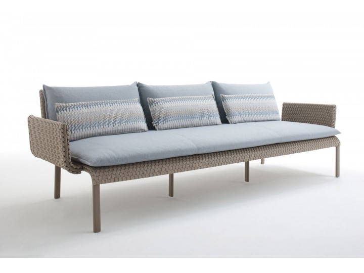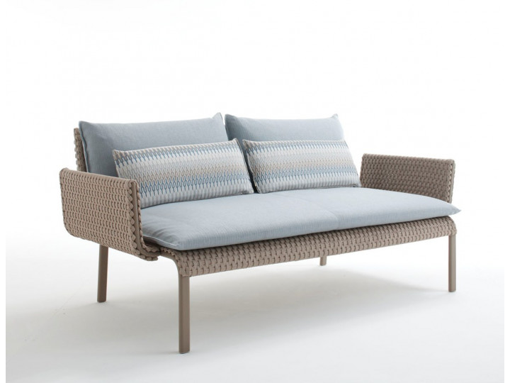 Outdoor sofa, aluminum frame powder coated woven with sunrope. A sofa by the strong identity: comfortable, rich in its decoration though essential in the lines at the same time. Perfect for furnishing terraces, patios and verandas, it’s excellent also for indoor fittings.