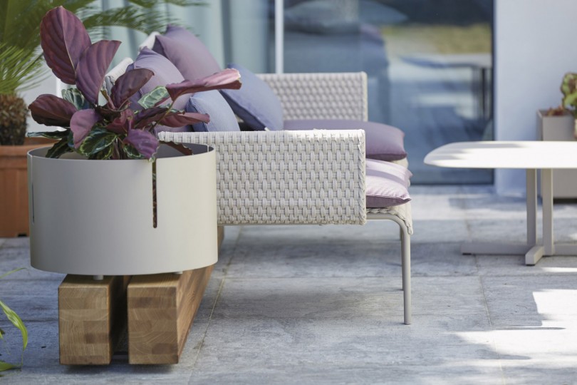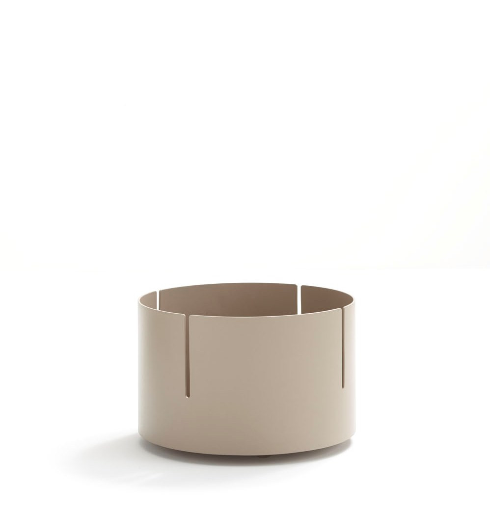 Outdoor round aluminum case, powder coated. It may be inserted in the beam or placed on the ground. Versatile, it can be used as an elegant flowerpot, as a partition between two rooms in a wide space or as a simple complement. Its curved silhouette breaks the linearity of the beam, creating a shape contrast within the space. Ideal for both residential and contract fittings and garden furniture too.