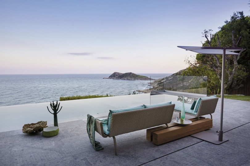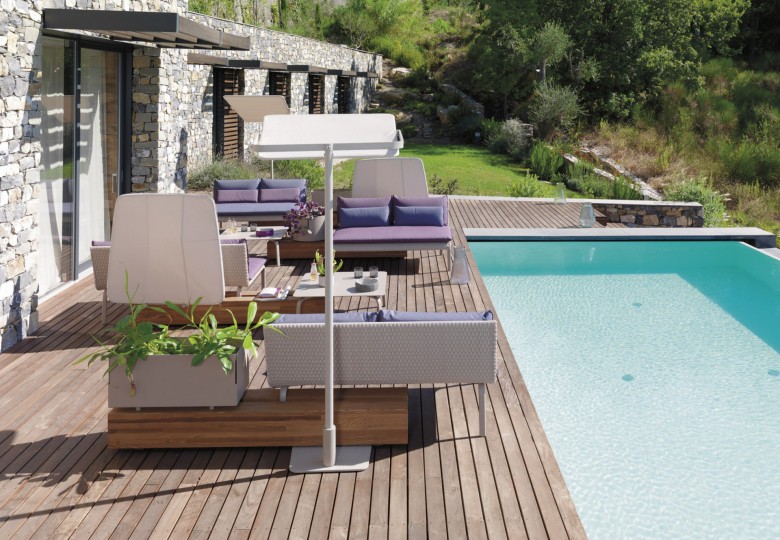Sunshade, stainless steel and aluminum frame with Polyscreen textile. Geometric and essential, this sunshade is vertically adjustable and can be easily combined within the outdoor compositions. Ideal for contract projects, it is suitable as well for residential fittings, giving a touch of simple elegance to pool and relax areas.