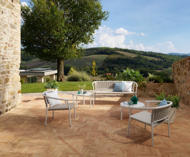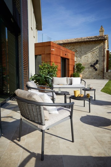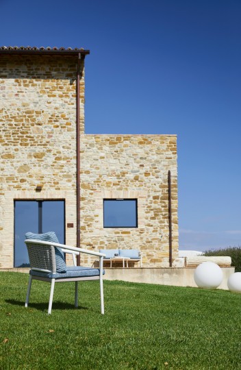 Armchair, aluminum frame powder coated, woven with Oval Searope. The design makes an elegant embrace, while the cleverly interpreted weave completes the refined simplicity of this armchair, perfect for creating a welcoming environment both in residential and contract settings, suitable for indoor and outdoor.