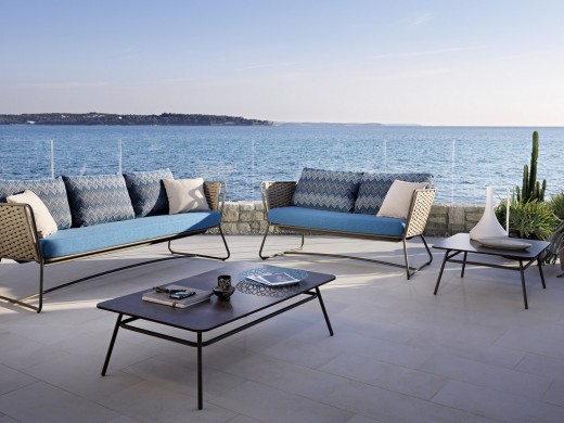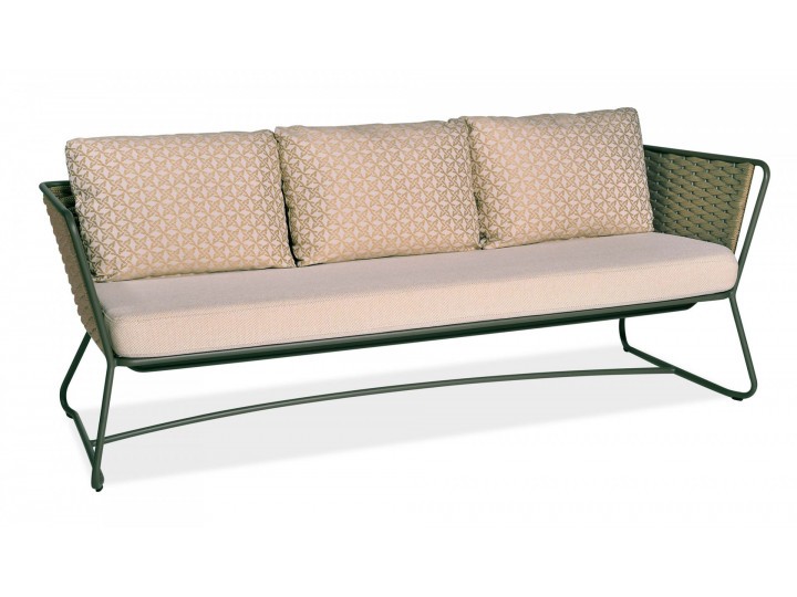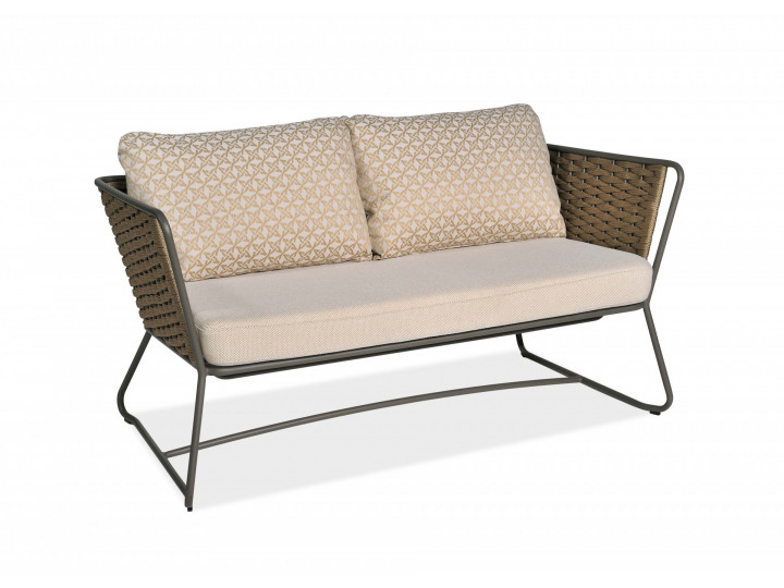 Outdoor sofa 2 seater, aluminum frame powder coated and woven with Nautic Rope. Sofa with a traditional silhouette, it reminds that classical furniture that never goes out of style. Excellent to supply terraces and patios, it fits well also into indoor living areas, waiting rooms, hall. For contract and residential use.