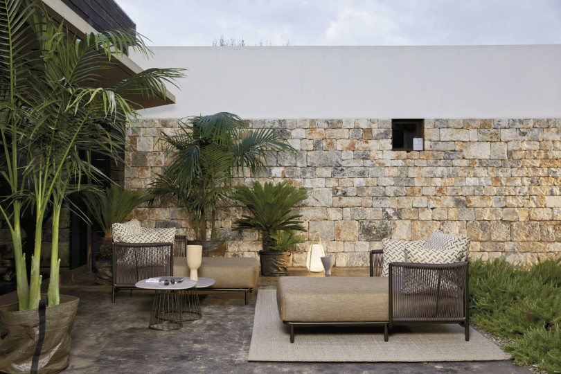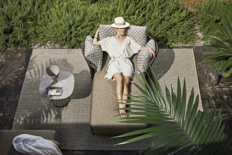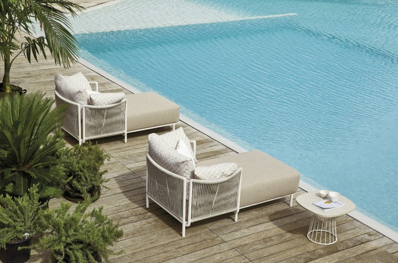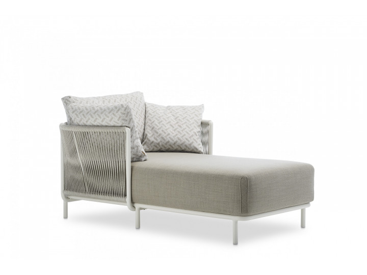 Chaise longue, aluminum frame powder coated, woven with Round Trendyrope. Aesthetics and comfort meet in this chaise longue with an elegant and evocative design, where the verticality of the weaving creates a game of transparencies with a timeless style. Ideal for decorating terraces, patios and pool areas. Suitable for residential and contract furnishing, outdoor and indoor.