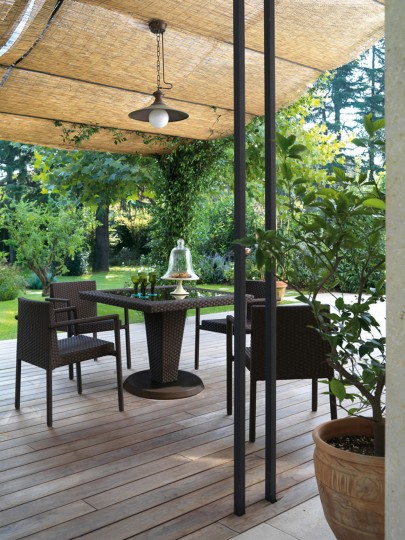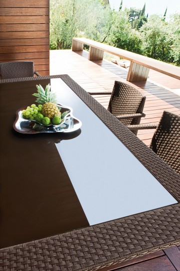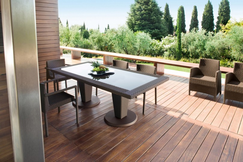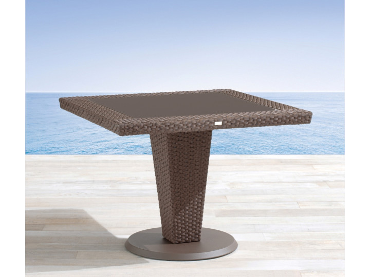 Outside table with tempered moka glass top and moka cast iron base. A timeless table, excellent for the garden furniture. Its conical shape is enriched with the moka glass top, solid and resistant, ideal for outdoor use yet suitable also for indoor fittings. Table for private and contract projects.