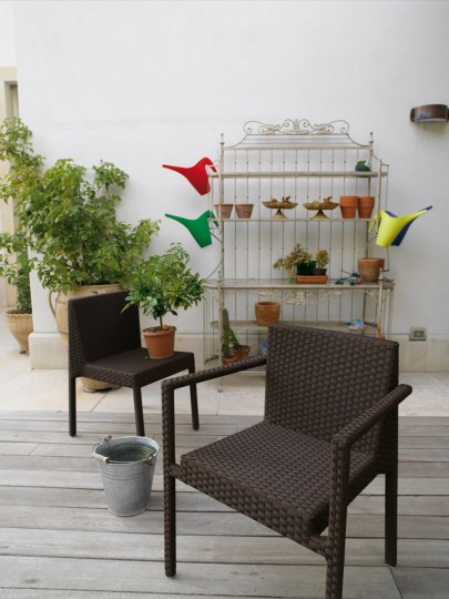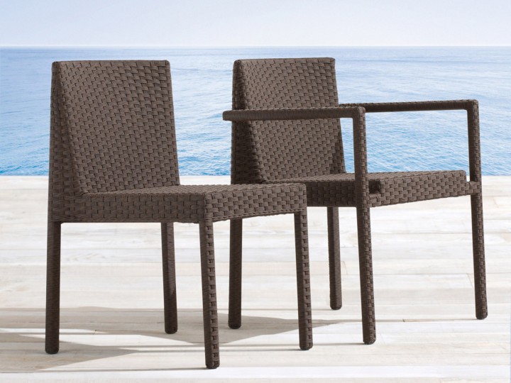 Outdoor dining armchair, aluminum frame and Sunloom. Traditional lines and precious woven make this armchair a timeless complement. Perfect for furnishing gardens, terraces, verandas, both in private as well as in contract projects.