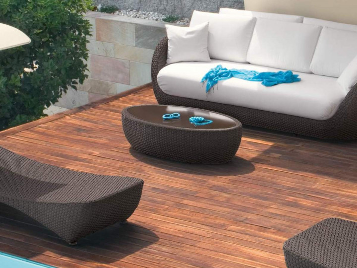 Outdoor coffee table, aluminum frame and Sunloom with moka glass top. This oval shaped occasional table, is perfect for an outdoor use thanks to the quality and resistance of the materials. Excellent in pool and wellness areas, gardens and terraces, it’s suitable also for indoor fitting in contract and private projects.