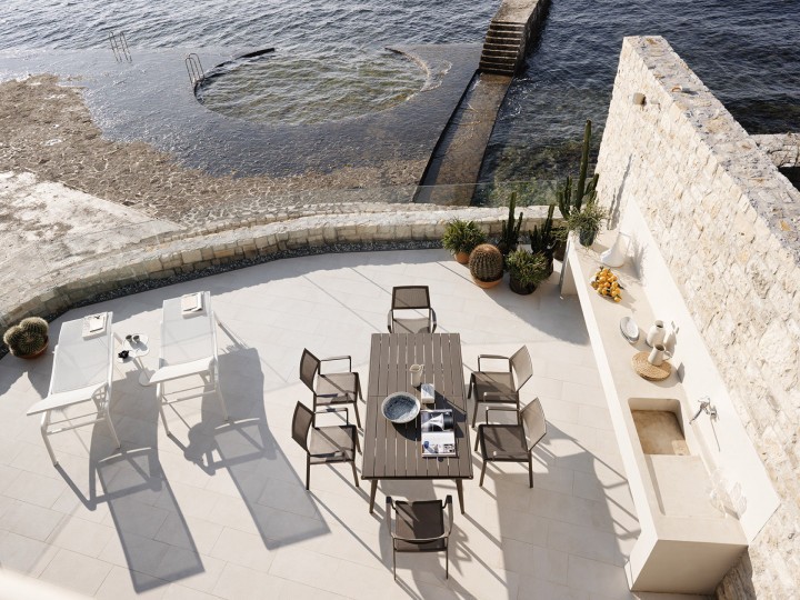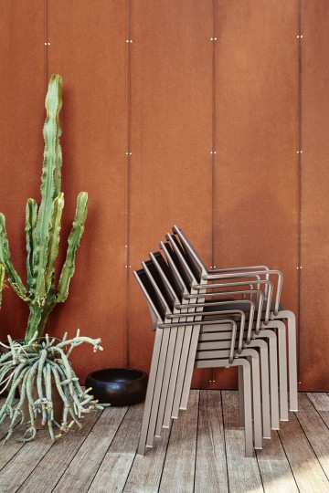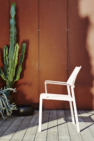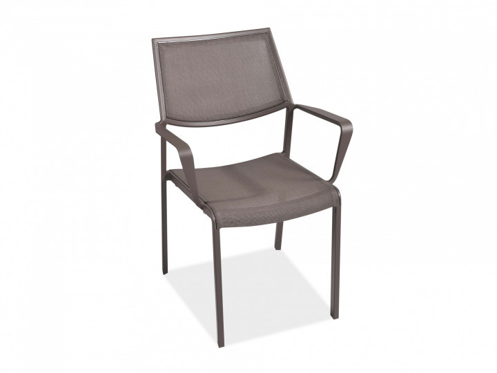 Outdoor dining chair with armrests, aluminum powder coated and textilene. A classic chair, practical and stackable, its distinctive trait is the back lightly curved that makes it very comfortable and ergonomic. Excellent for furnishing terraces, outdoor and indoor dining areas, restaurants and bars. It’s perfect for contract projects.