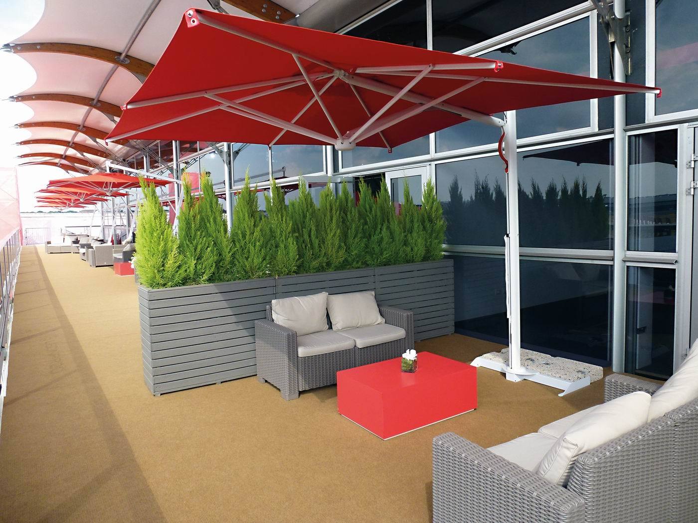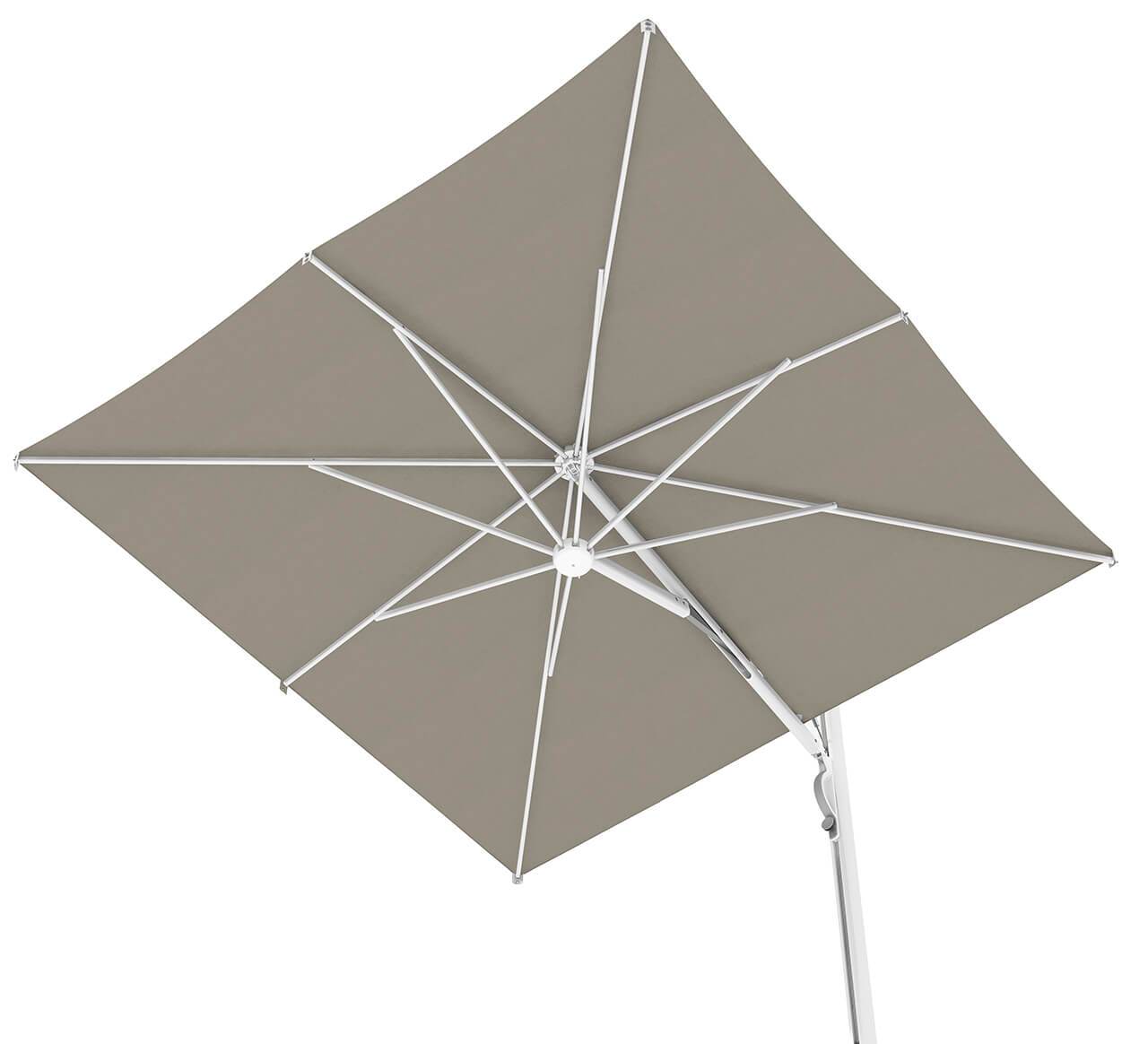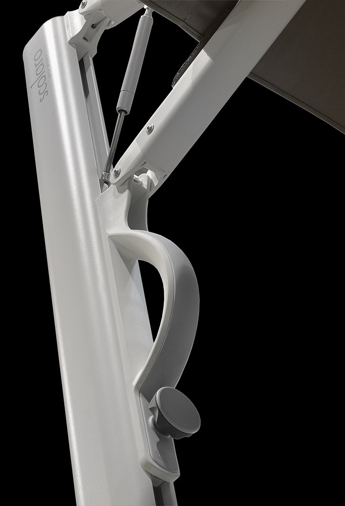 Futuristic product suitable for modern and minimalist settings. The frame has a StarWhite powder-coated finish. The MOTION system allows the umbrella to retract close to the pole without having to move the furniture beneath it.