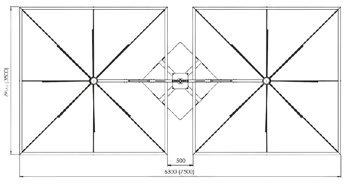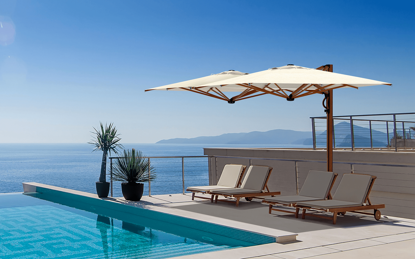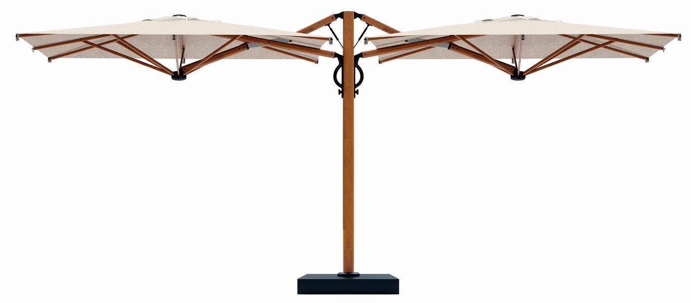 Evolution of the single parasol Astro. Suitable for all environments. Aluminium frame with wood effect. Strong structure composed of 2 parasols anchored to a single support. Solution designed for large surfaces. Retractable opening and closing above tables and chairs without moving the furniture provided by gas spring.