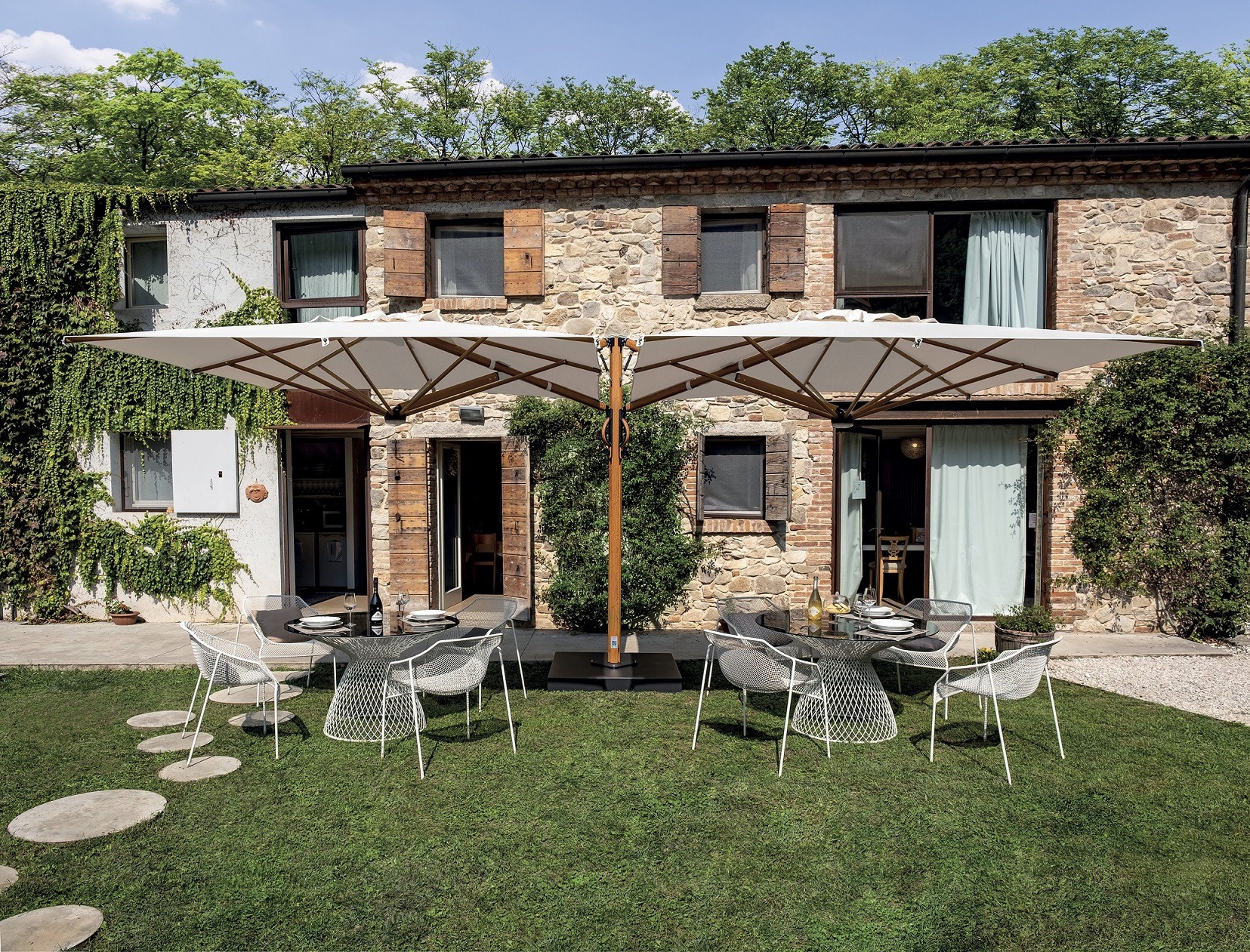 Evolution of the single parasol Astro. Suitable for all environments. Aluminium frame with wood effect. Strong structure composed of 2 parasols anchored to a single support. Solution designed for large surfaces. Retractable opening and closing above tables and chairs without moving the furniture provided by gas spring.