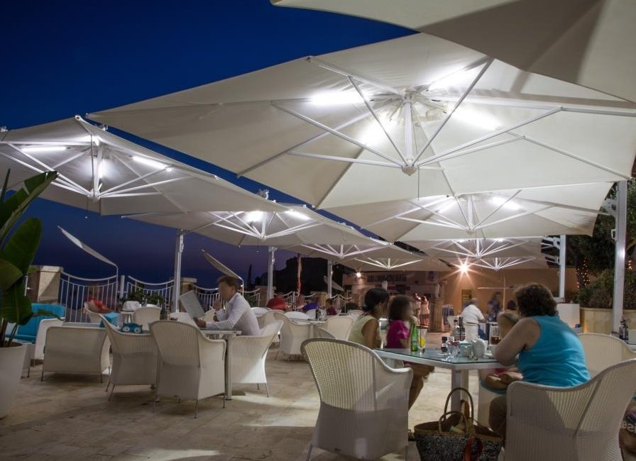 Cantilever parasol with retractable closing system is also available in size 4×4 mt with a further strengthened structure, is now available with frame epoxy coated color starwhite matt.