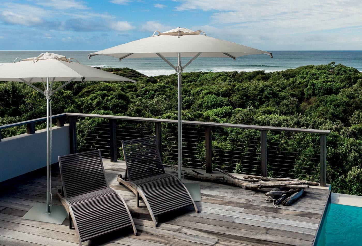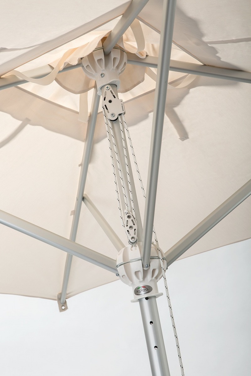 Parasol developed to meet the needs of a compact, robust and handy product. It can be placed in multiple locations and environments. Suitable for use in bathing, pools, balconies and terraces.