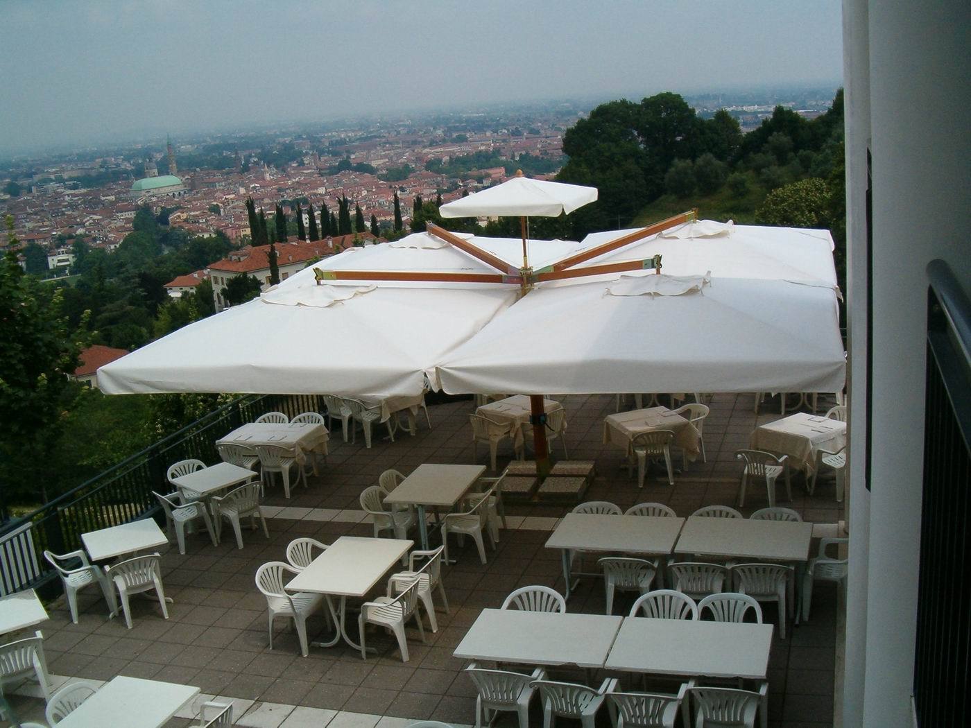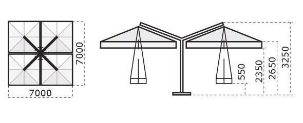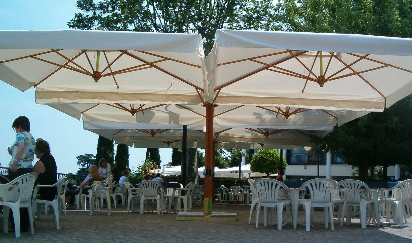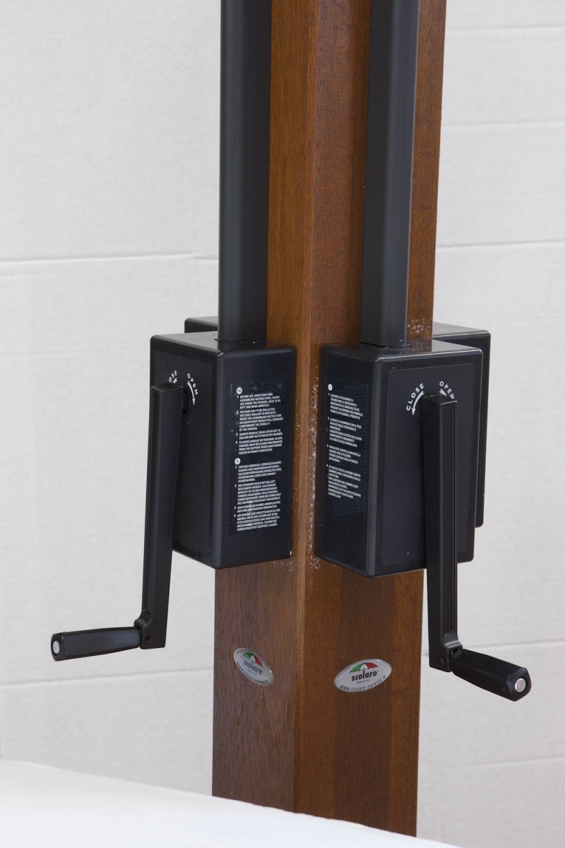 Strong structure made of 4 cantilever parasols (Poker) or 2 cantilever parasols (Double). New vertical aluminium post with special Iroko wood finishing and ribs made of Iroko wood. Steel components powder coated anthracite grey. Nylon accessories.