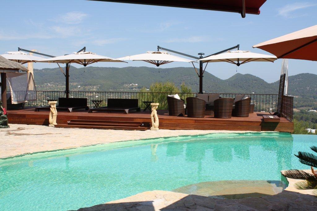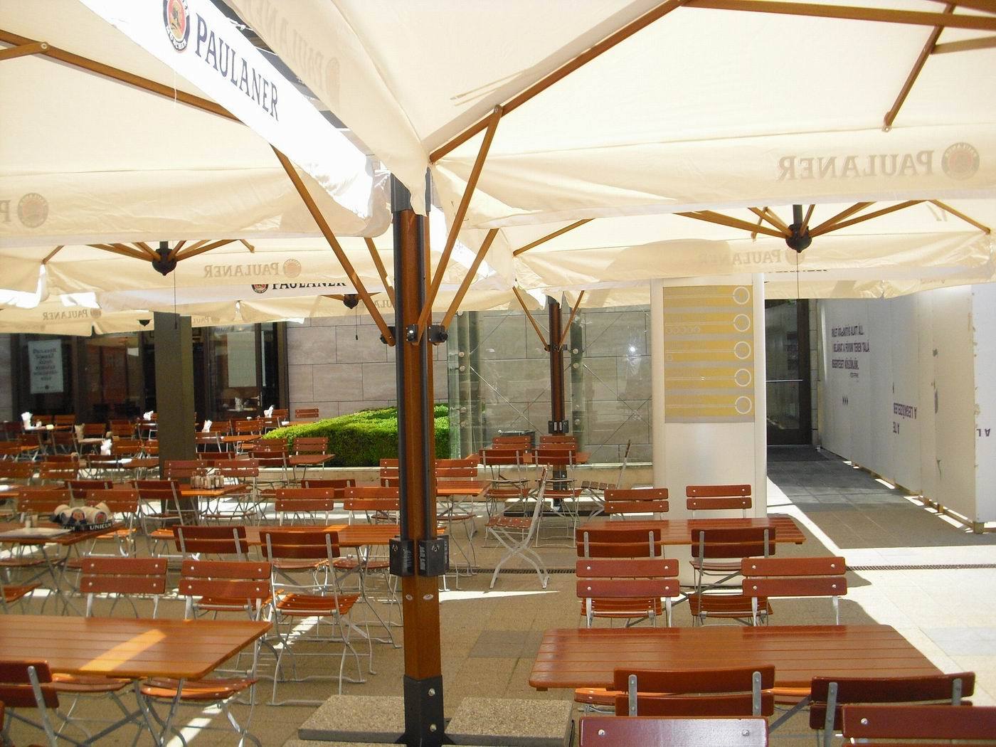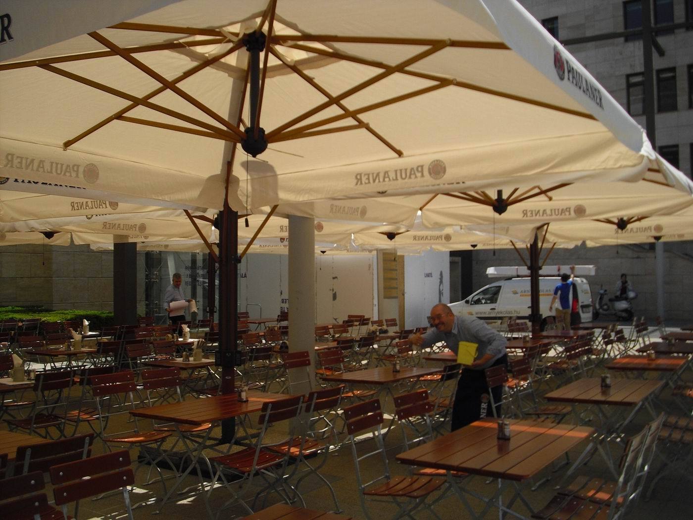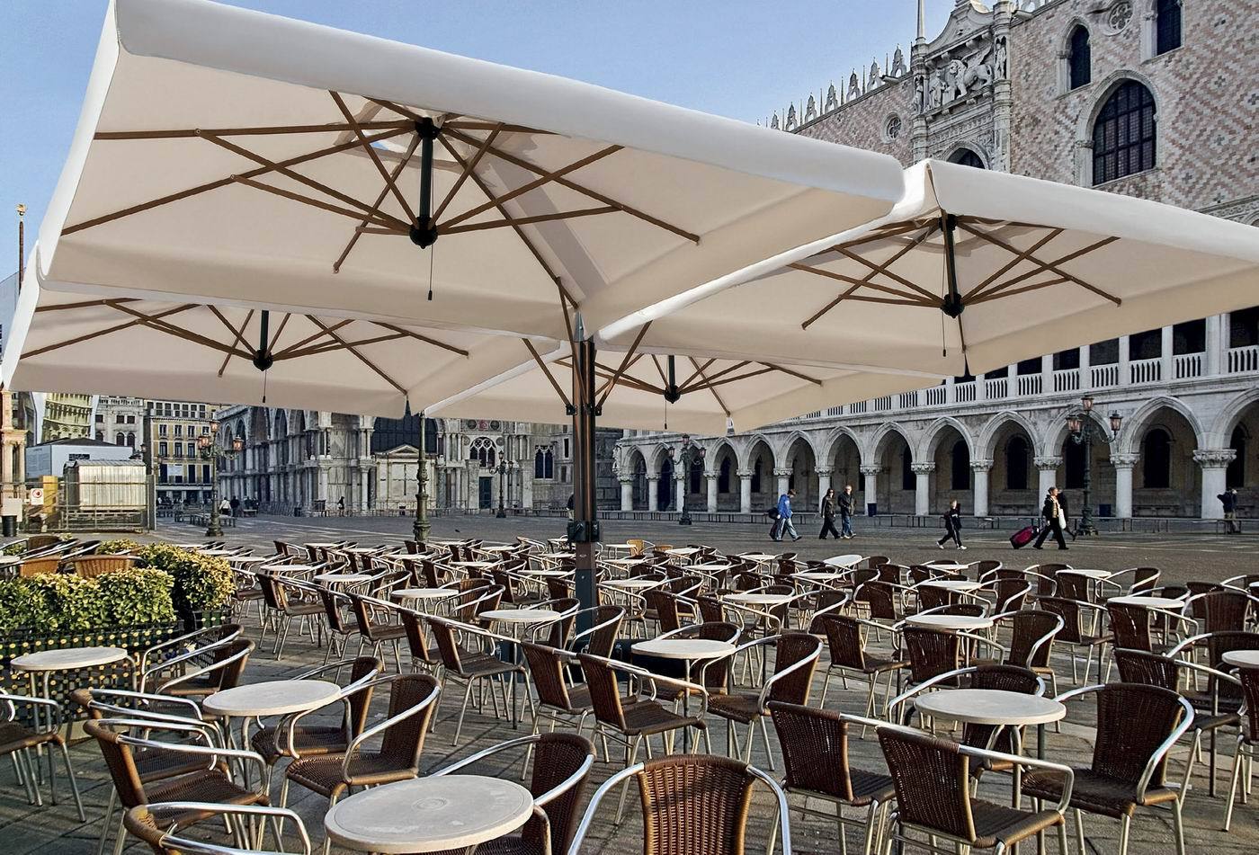 Strong structure made of 4 cantilever parasols (Poker) or 2 cantilever parasols (Double). New vertical aluminium post with special Iroko wood finishing and ribs made of Iroko wood. Steel components powder coated anthracite grey. Nylon accessories.