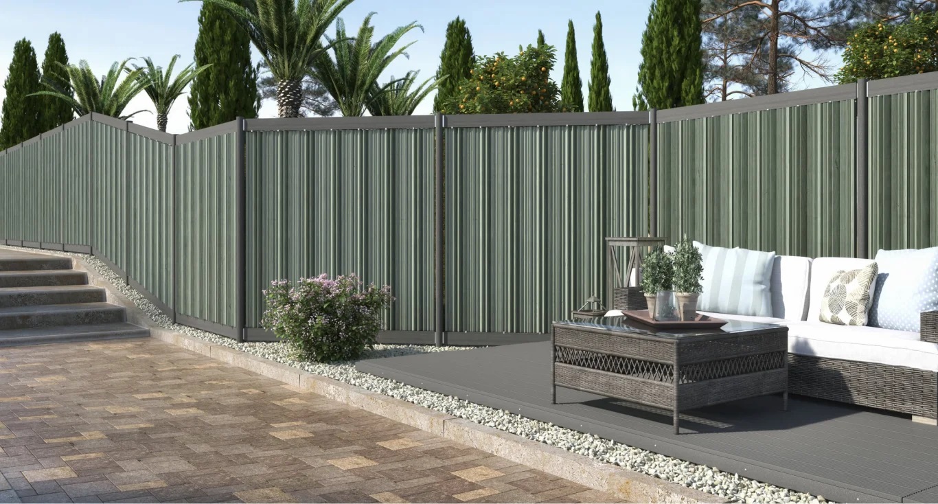 Successfully enjoy a degree of privacy and emphasize features with the “Blickfang” privacy screen fence. Its unusual appearance with marbled, corrugated panels immediately catches the eye. The material is colour-resistant and dirt-resistant. The panels almost clean themselves thanks to the vertical position and weathering. Doors and gates can also be suitably integrated and gradients as well as all types of angles can be tackled without any problems whatsoever. Our posts are also extremely durable – we provide you with a 25-year guarantee against rotting in the ground. In short: The perfect boundary option for your garden!