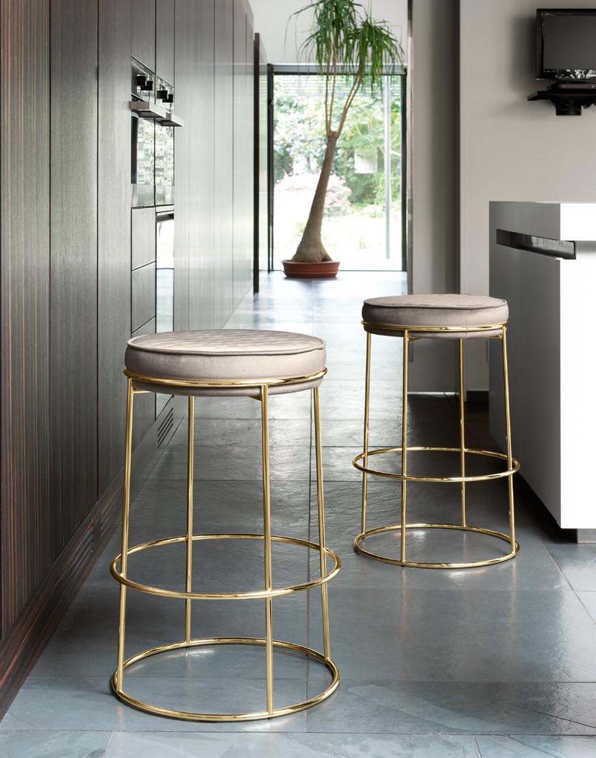 This ATOLLO stool has a metal frame and an upholstered quilted seat in velvet or faux leather. Exuding edgy elegance, Atollo goes to complete the set of coffee tables, benches and ottomans all of which feature a subtly slender metal rim available in a polished brass. With its slick design and harmonious proportions, it adapts seamlessly to individual requirements and fits perfectly into any interior setting.