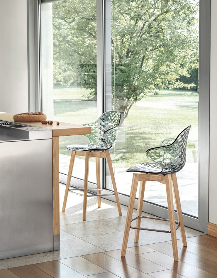 The SAINT TROPEZ stool is also available with a wooden frame and an exceptionally elegant chrome-plated footrest.