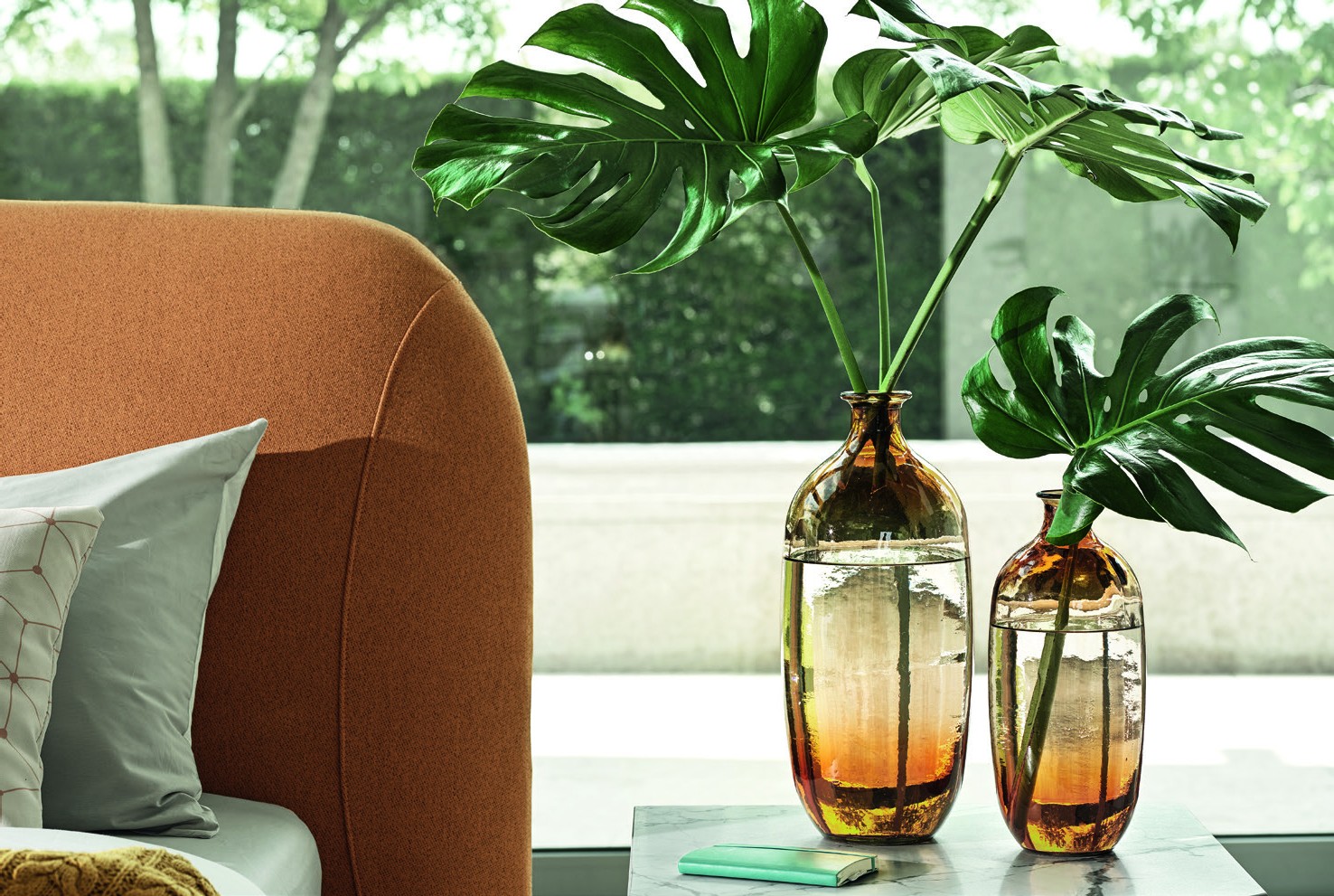 Calligaris enhances its offering with new decorative household accessories made from entirely recycled coated glass, thus harmoniously marrying respect for the environment and refined interior décor. Narrow-necked vase with an attractive surface featuring double colour nuancing.