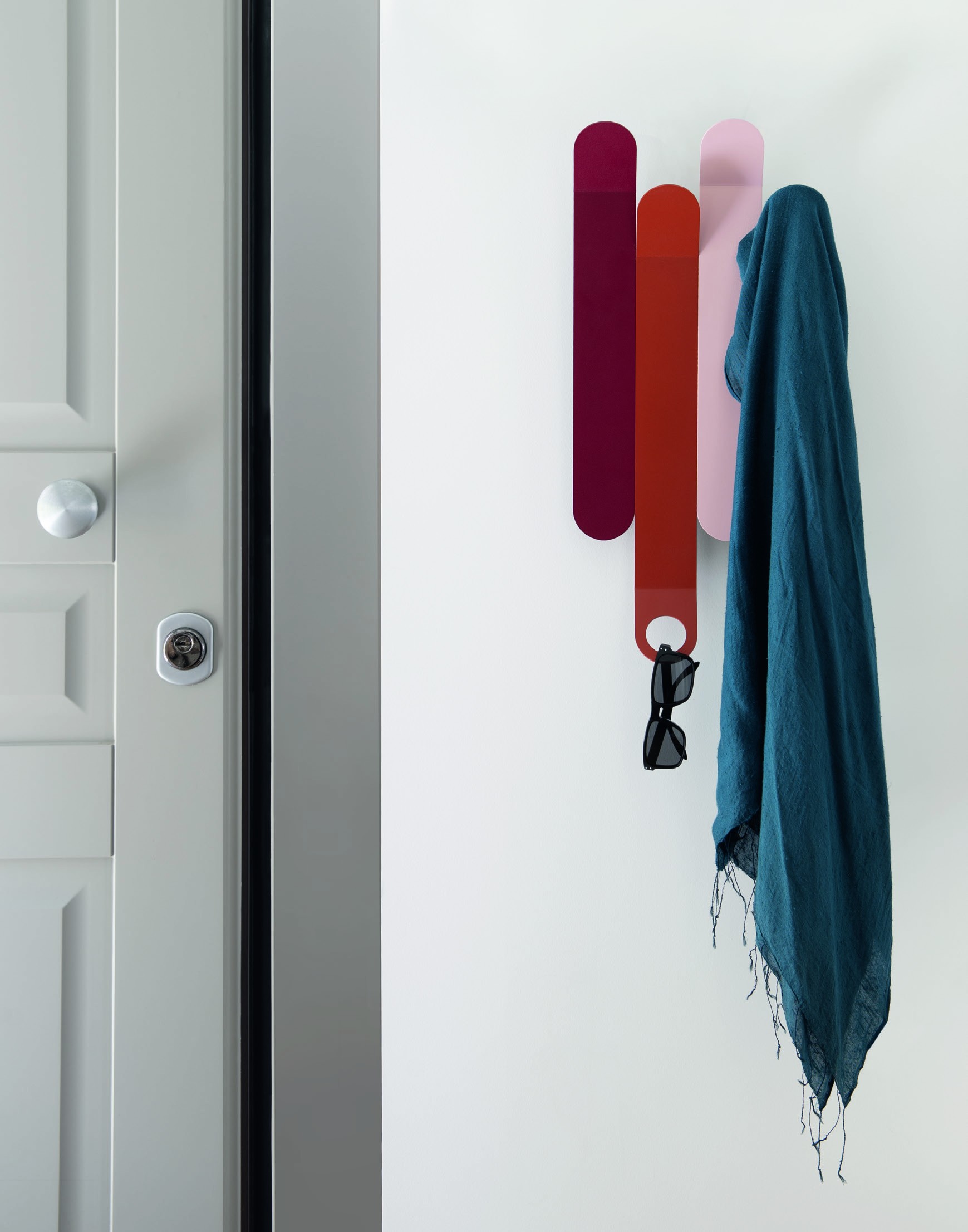 SKYLINE is a decorative and discreet wall-mounted coat hook. The 4 shaped sheet-metal elements are attached to a melamine-faced panel. Two of the elements have a hole at the bottom which can be used to hang umbrellas. Its vibrancy and color make it ideal for the home’s entrance, but also for other rooms including a child’s bedroom.