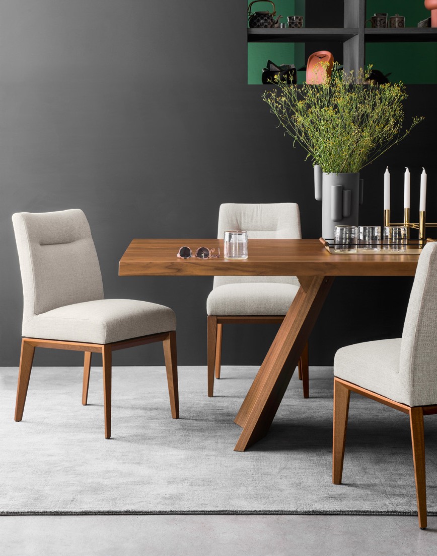 Triangular legs in solid wood. Seat fitted with elastic bands. TOSCA is just as comfortable as a sofa, thanks to its extra soft fully upholstered seat. Suitable to decorate the dining room of your house or a restaurant, TOSCA is synonymous with unrivalled comfort.