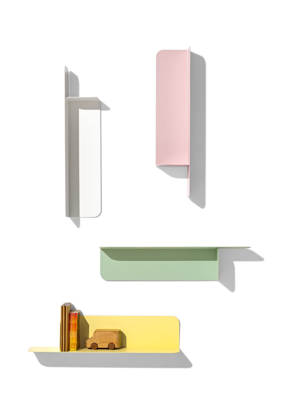 BIBLI shelf in folded sheet metal with rounded corners to be anchored to the wall via a partially adjustable metal rod with holes.