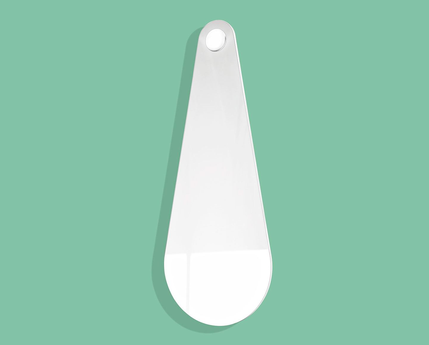 DROP model mirror with drop-shaped design and decorative wooden element. To be fixed to the wall. DROP is a drop-shaped mirror fixed to the wall, decorated at the top with a wooden insert in the same colour as the support pannel.