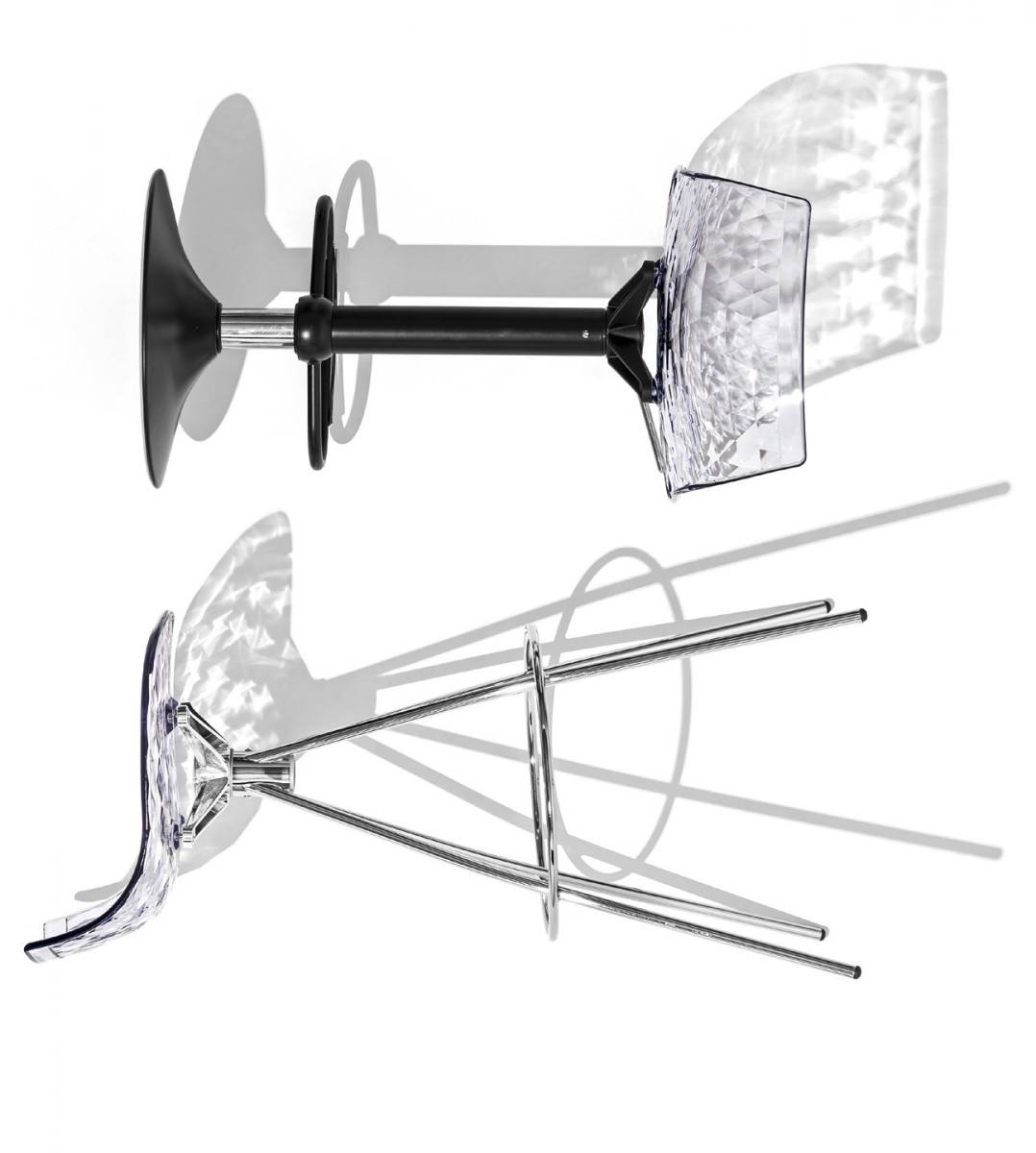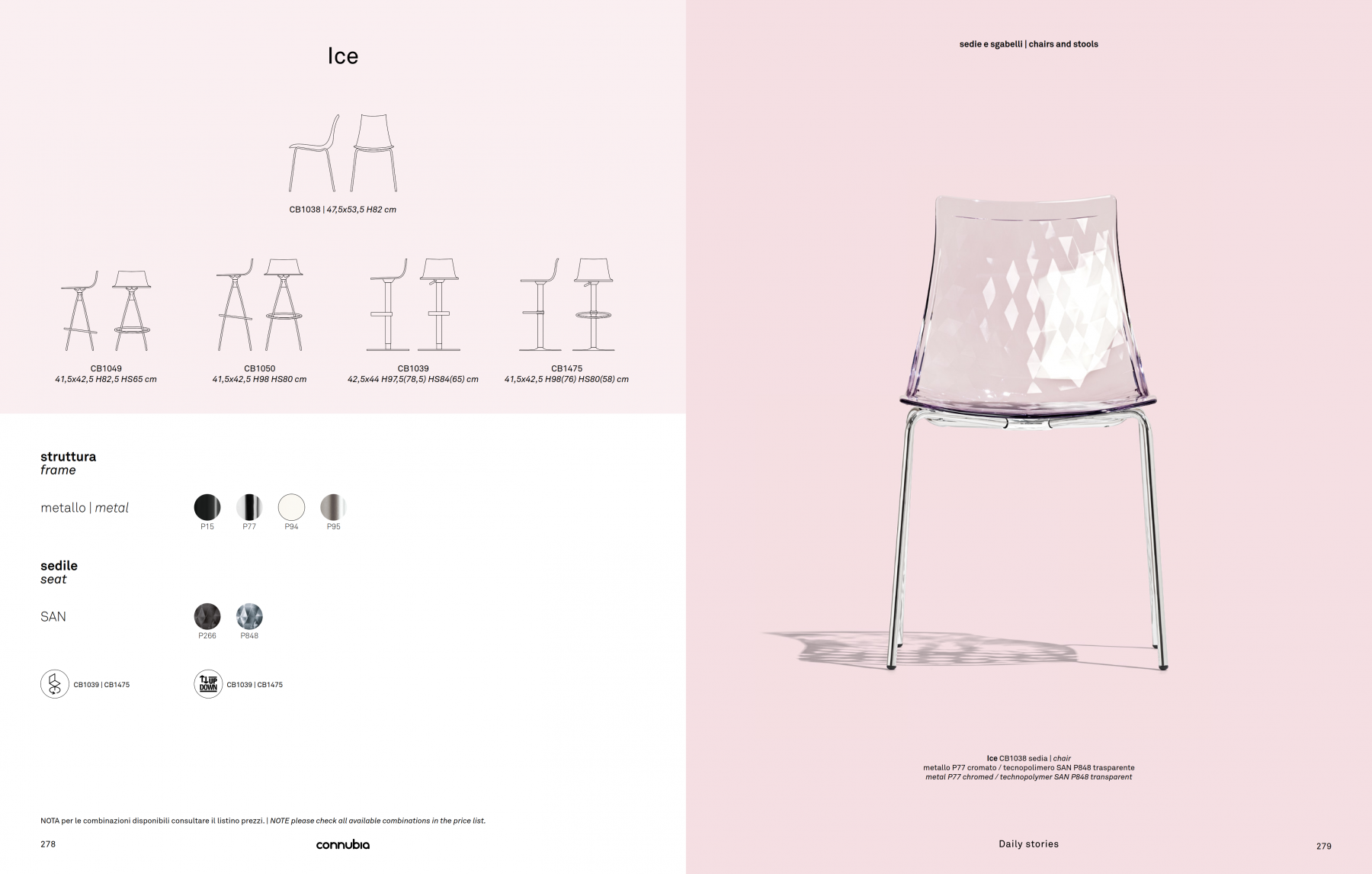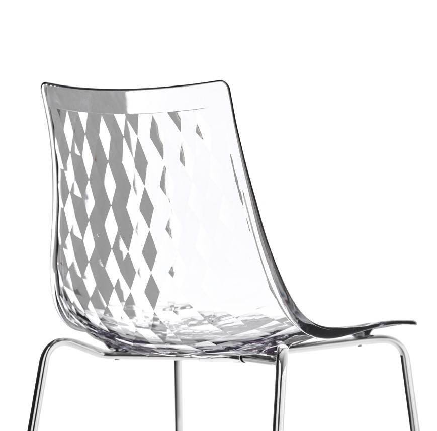 Model ICE chair, with metal frame and plastic monoblock seat. The main feature of this chair is the aesthetics of the shell, having a diamond effect, through which the designer has recreated the play of transparency and the crystalline formation typical of ice. The ergonomic seat is made of technopolymer while the classical 4-leg frame is made of thin steel tubing.