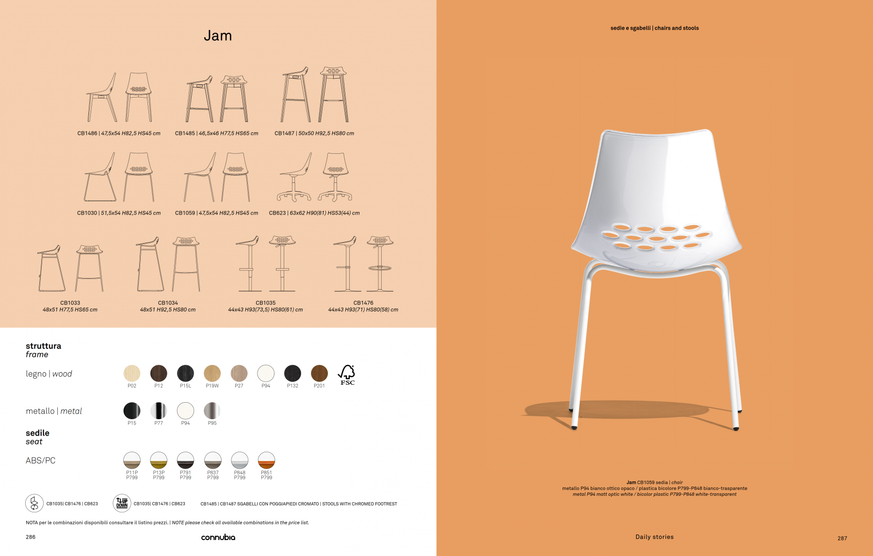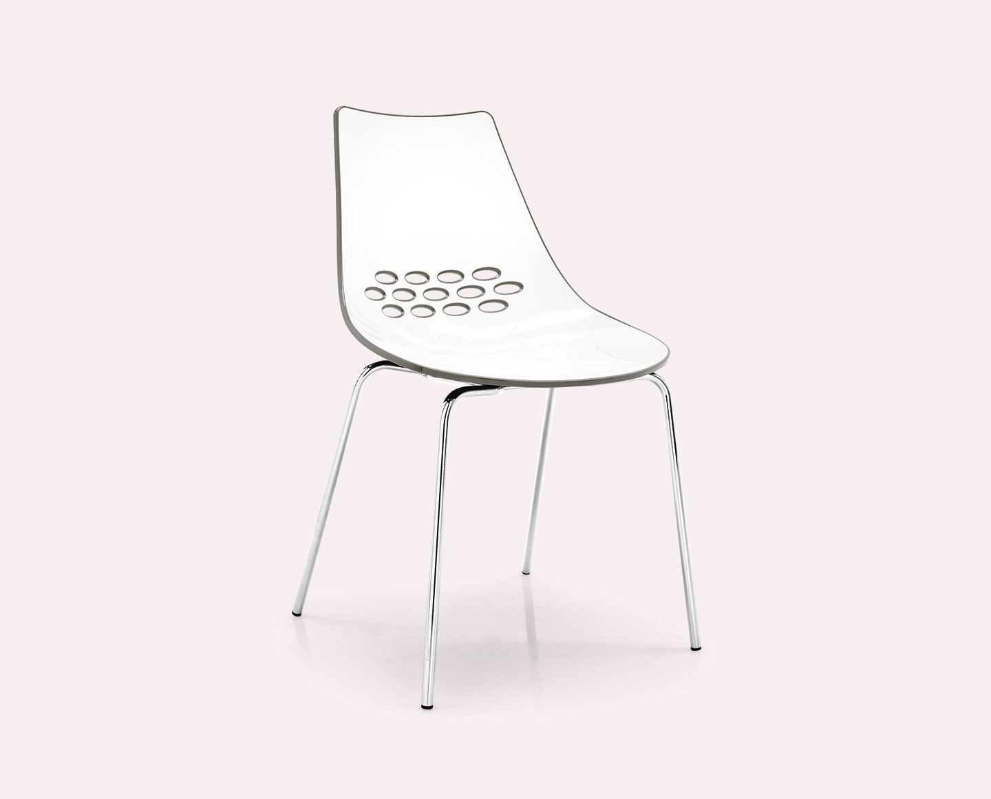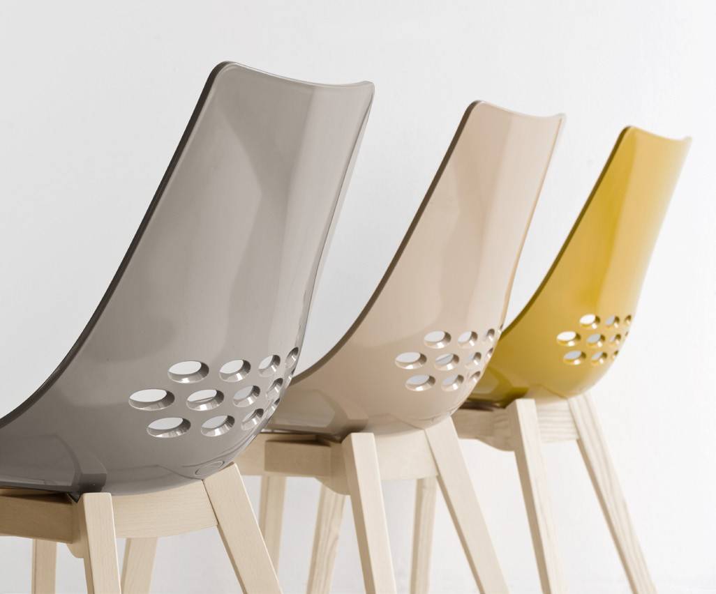 Model JAM chair, with a metal frame and two-colour technopolymer shell. The use of steel tubing has allowed us to achieve a light and sturdy chair with a star-shaped frame. The JAM W model features a wooden frame with metal footrest. The swivel chair features a metal base with five soft rubber castors. Colourful and modern, it adapts to different environments and uses: perfect both in the home study and in a waiting room.