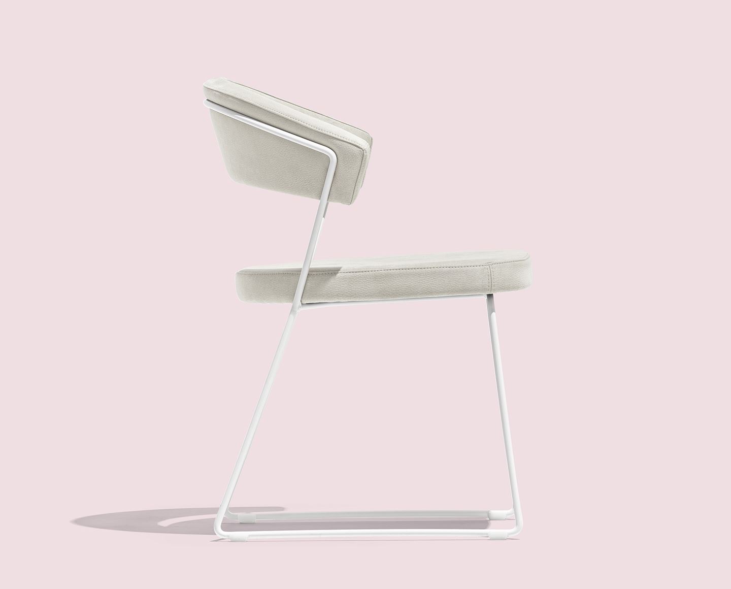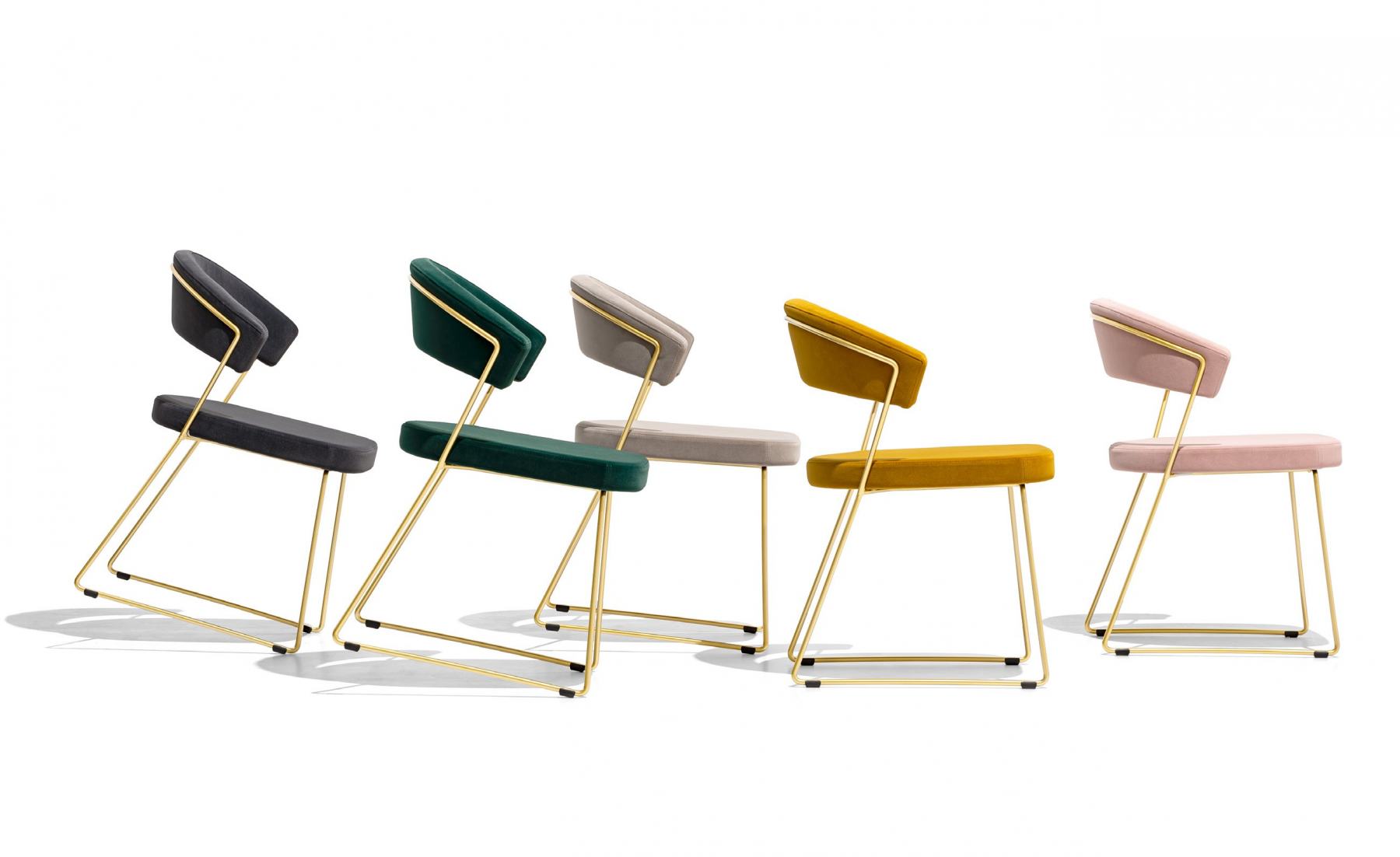 NEW YORK chair: metal frame and upholstered and covered seat/backrest. Sled base. The enveloping backrest and wide seat, which make the chair very comfortable, are both upholstered. The chair is also fitted with four plastic shockproof feet of neutral colour, placed under the sled base.