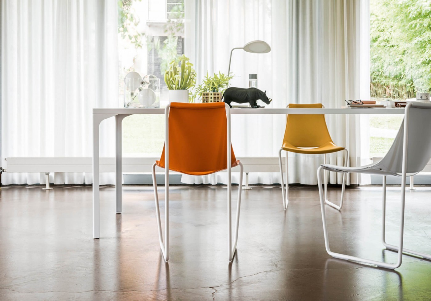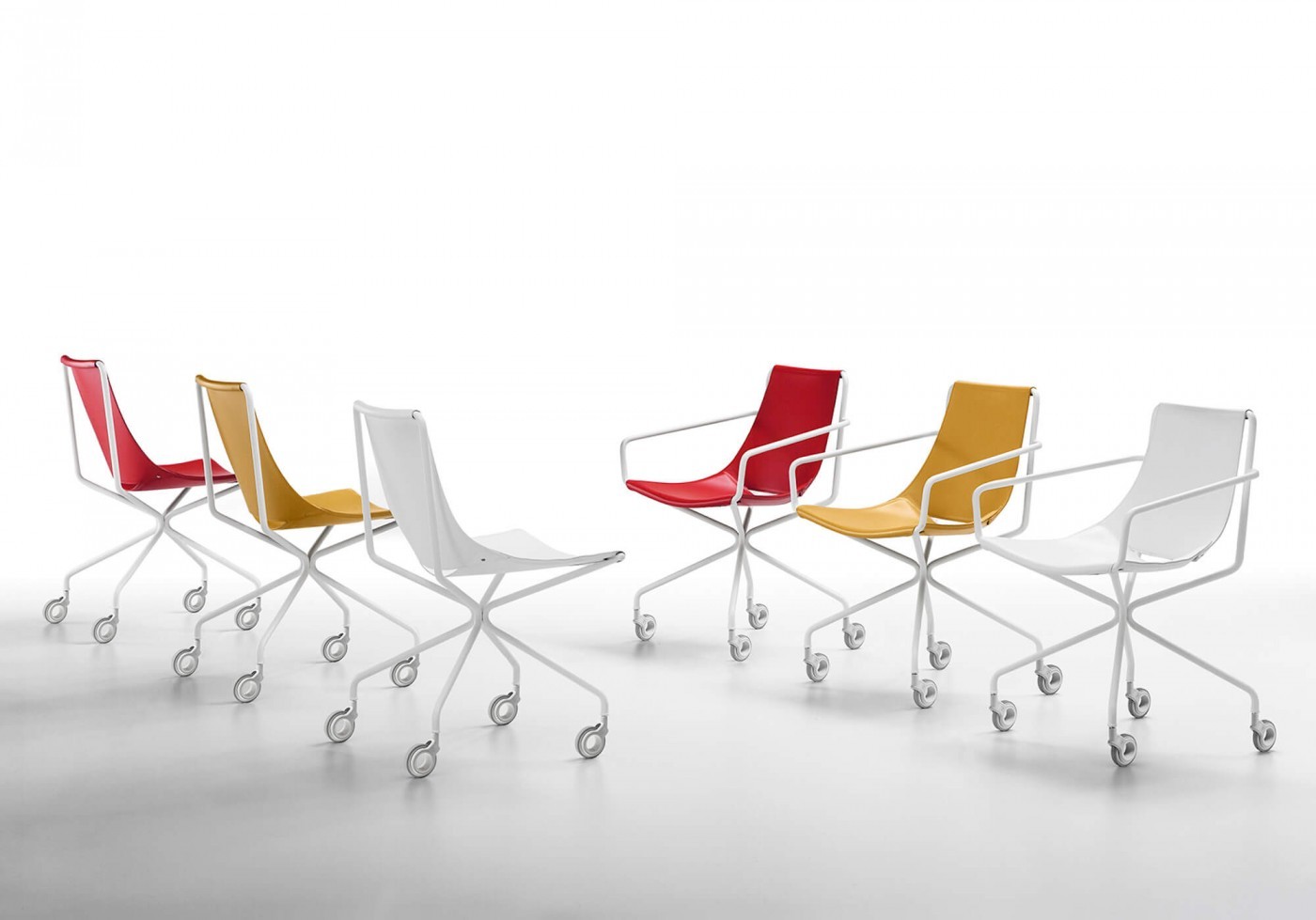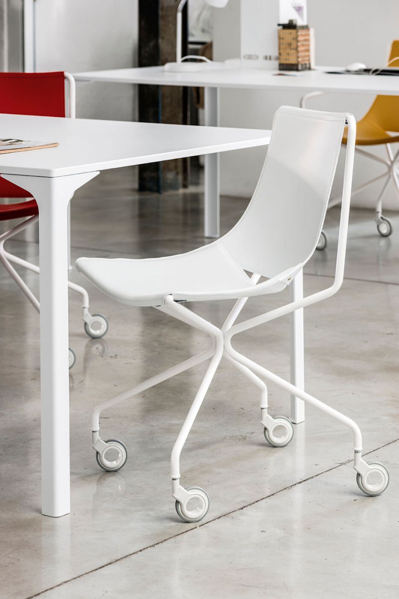 Apelle chair with sled base in lacquered steel. Seat and backrest in hide.