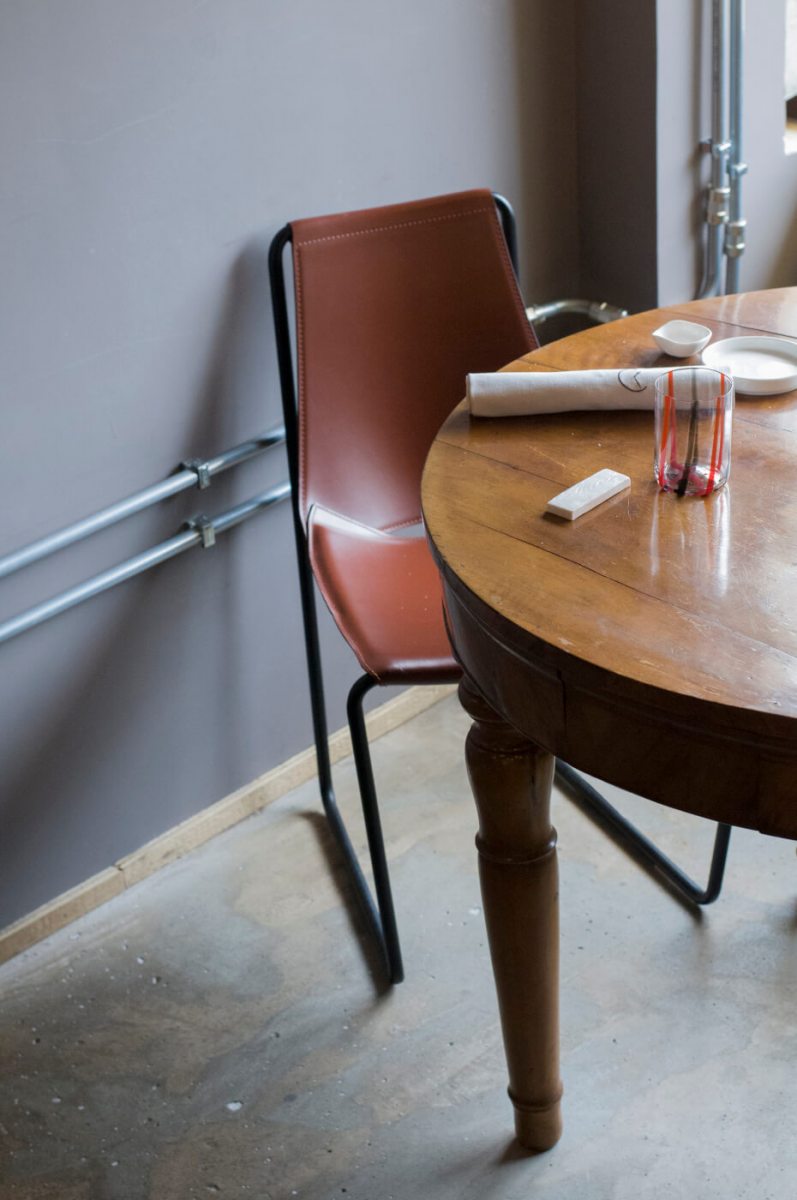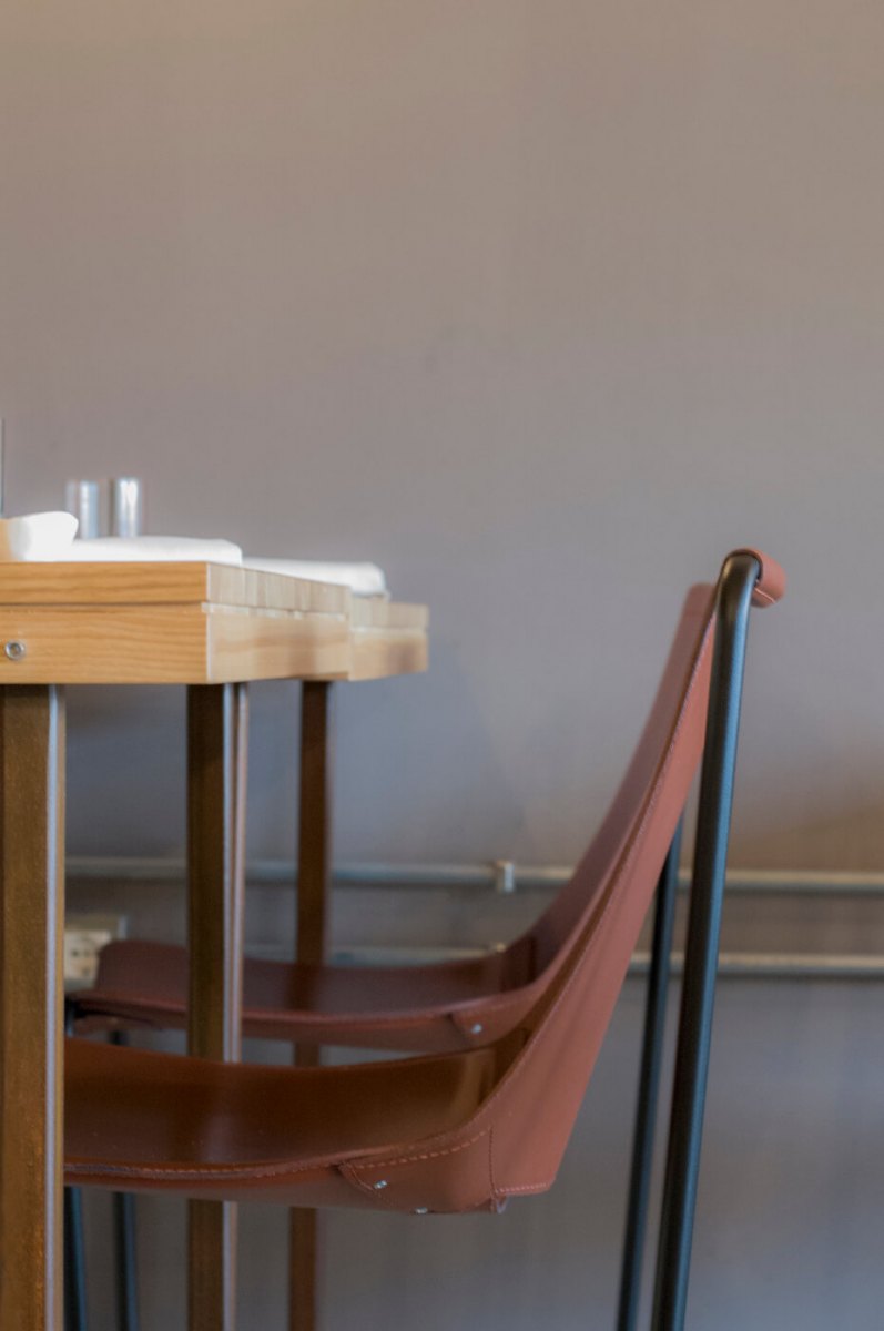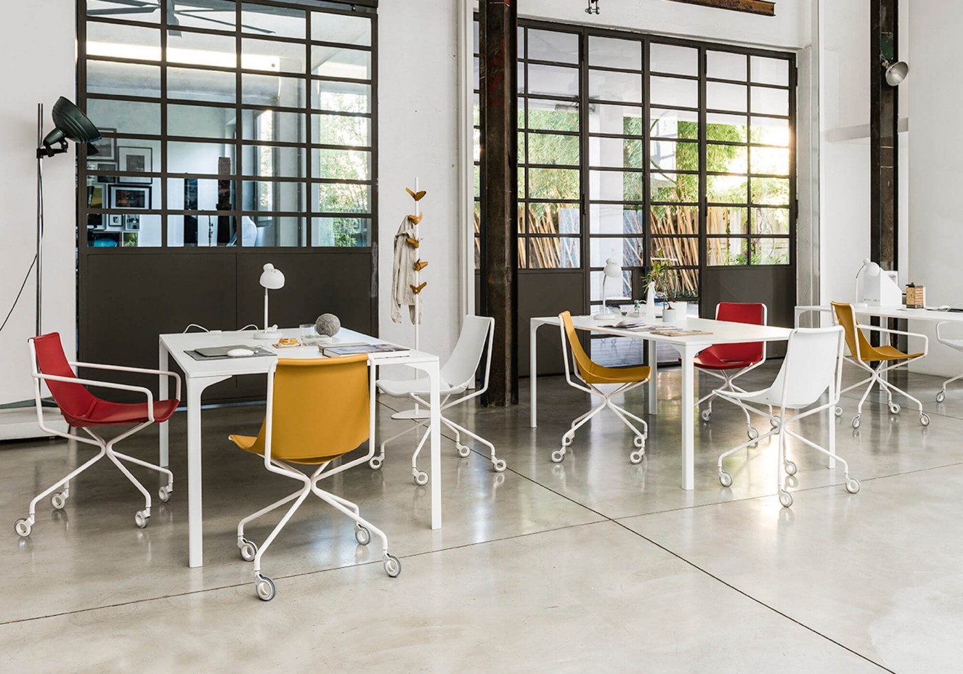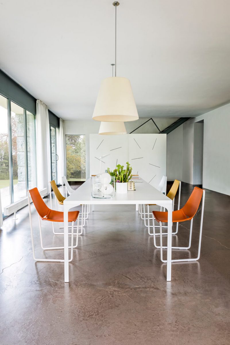 Apelle chair with sled base in lacquered steel. Seat and backrest in hide.