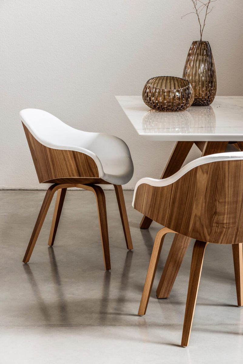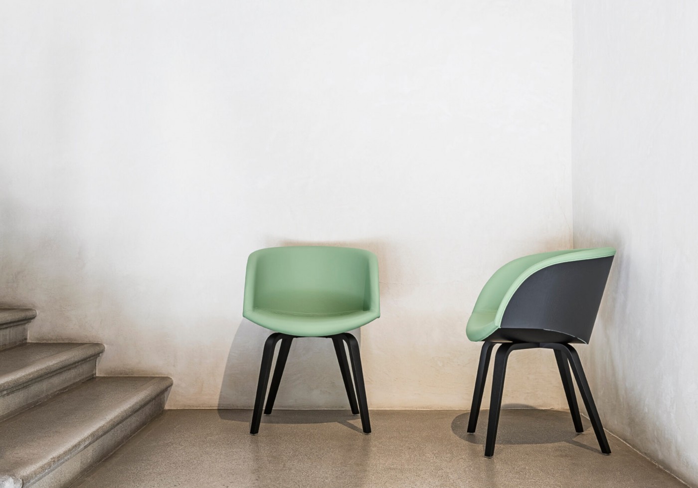 Danny armchair with wooden base. Shell upholstered in leather, ecoleather, fabric or custom’s fabric.
