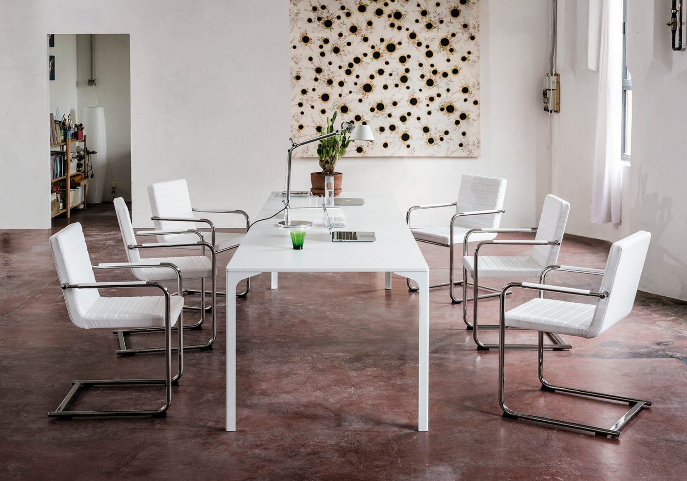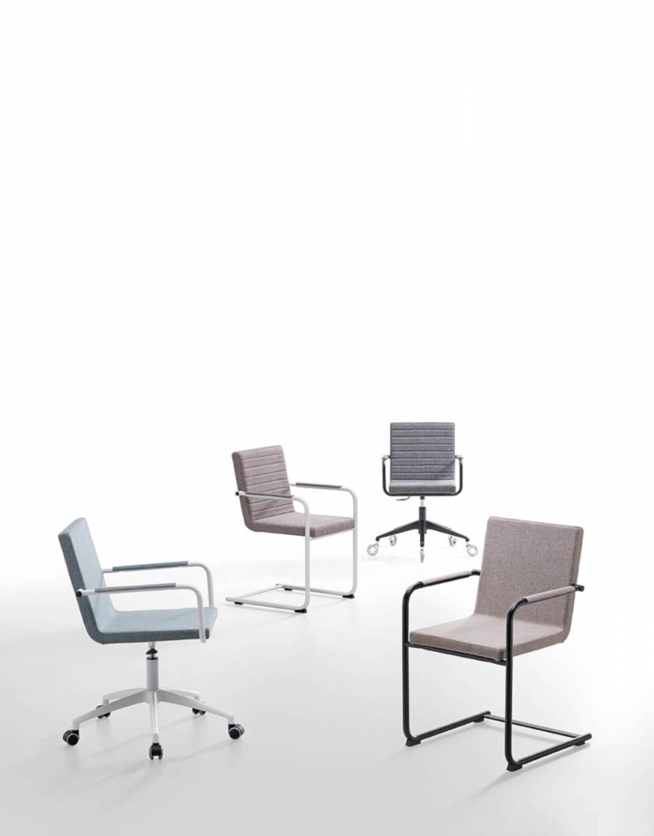 Armchair with 5 ways base and armrests in chrome. Shell upholstered in leather, faux leather, fabric or custom’s fabric.