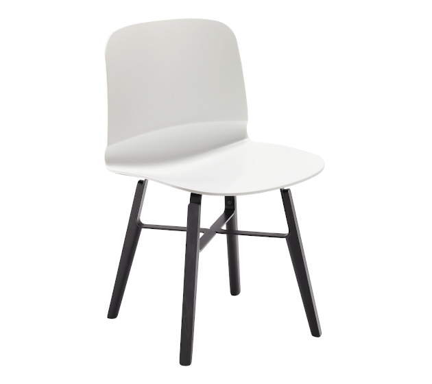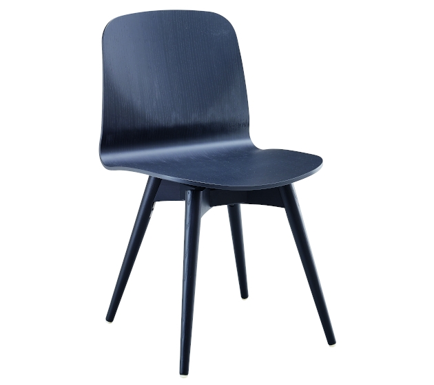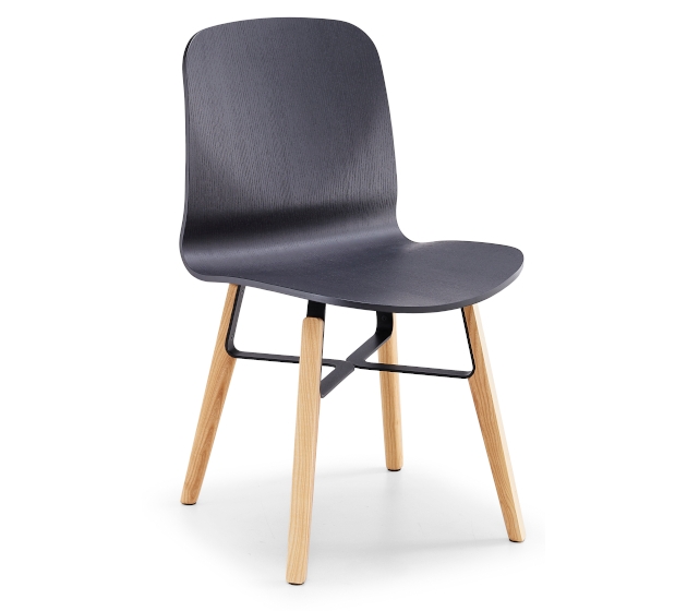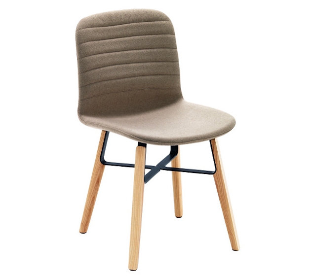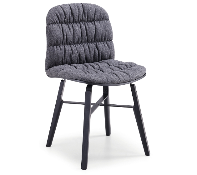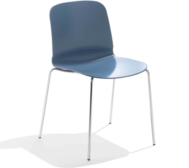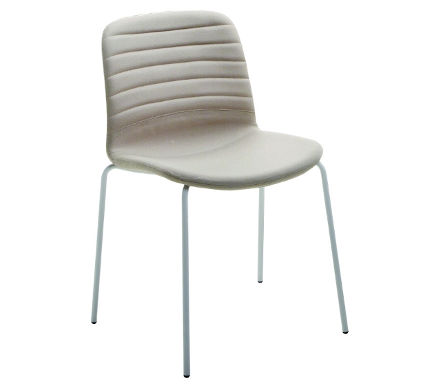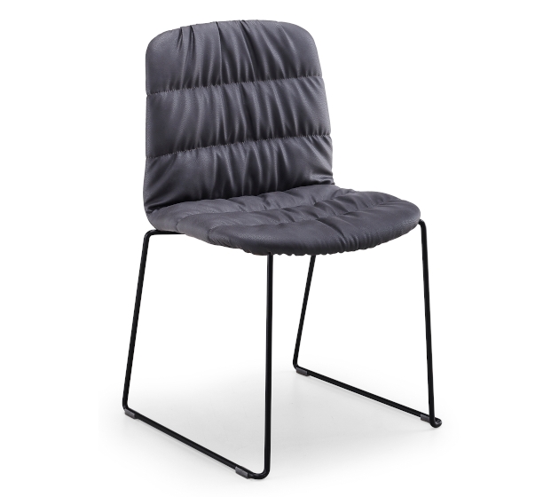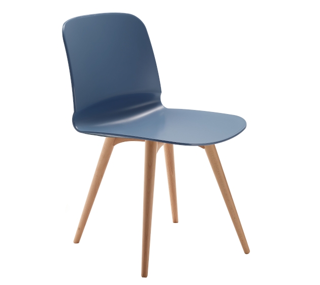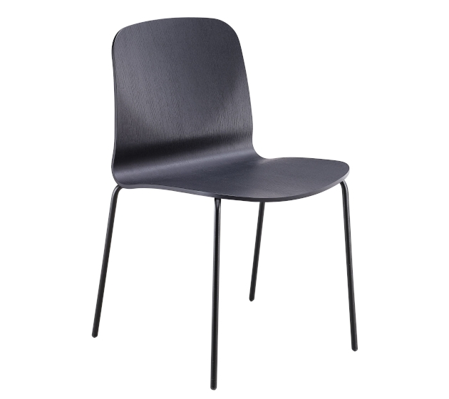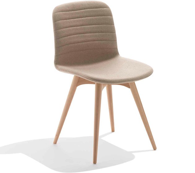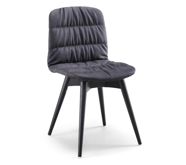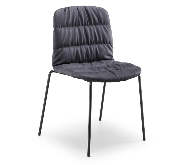 Chair with four legs base in wood and lacquered steel. Seat upholstered in leather, faux leather or fabric. Available version with wooden back face.