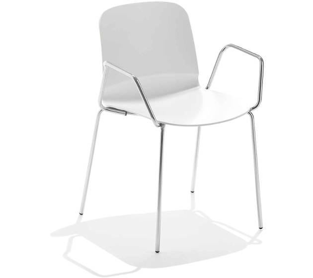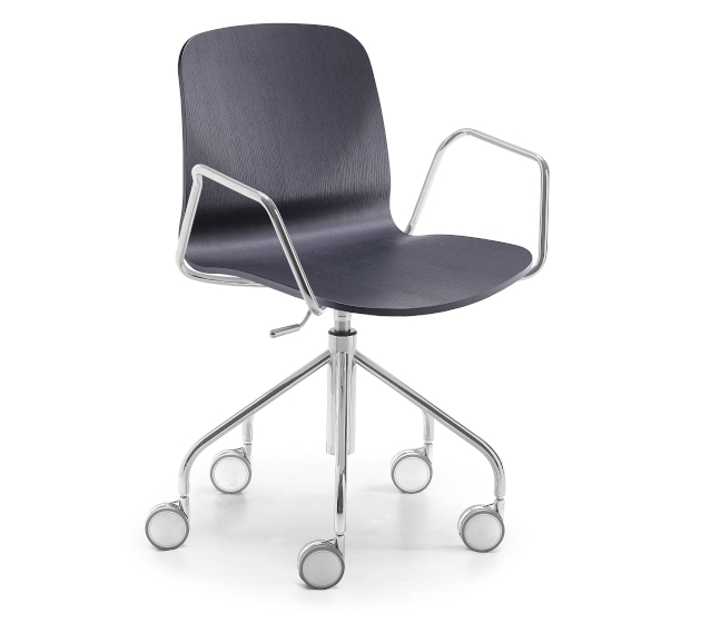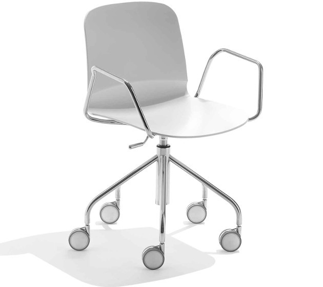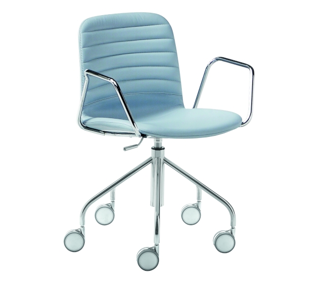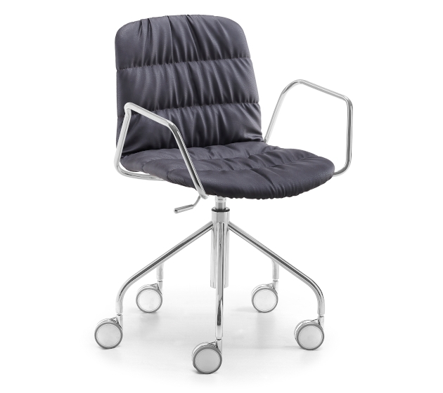 Also available with four leg frame in chrome or lacquered steel and with five ways base on wheels and gas-lift mechanism for height adjustment.