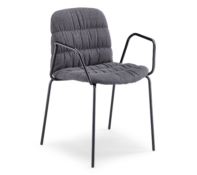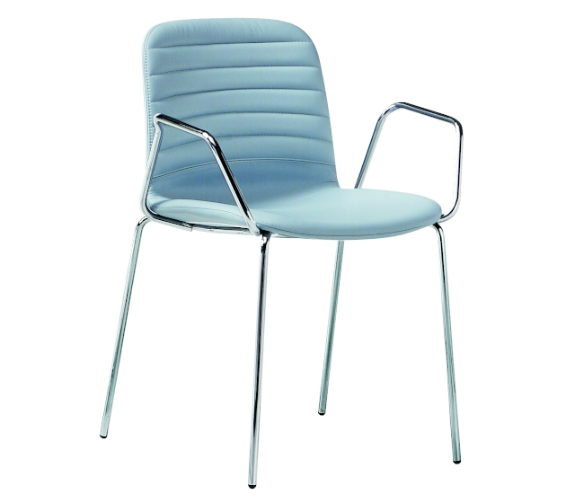 Liù chair with armrests. Steel structure with four legs base and seat upholstered in leather, faux leather or fabric with particular “wrinkled” lavoration. Optional: wooden back face.