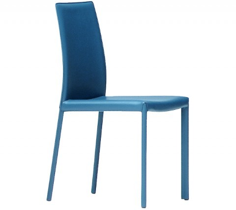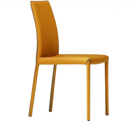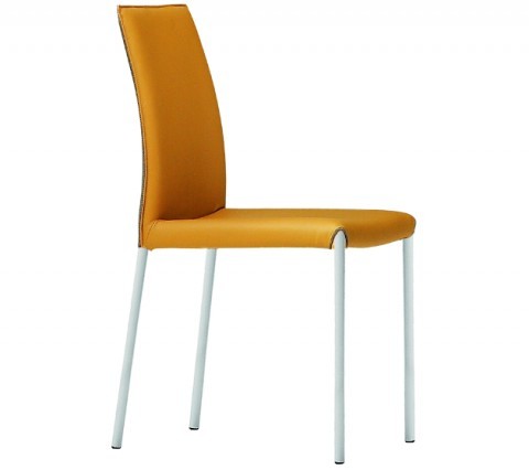 Chair with four legs in lacquered steel or completely upholstered with hide or regenerated hide. Possibility to upholster the back face with a different fabric, leather or ecoleather.