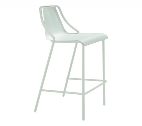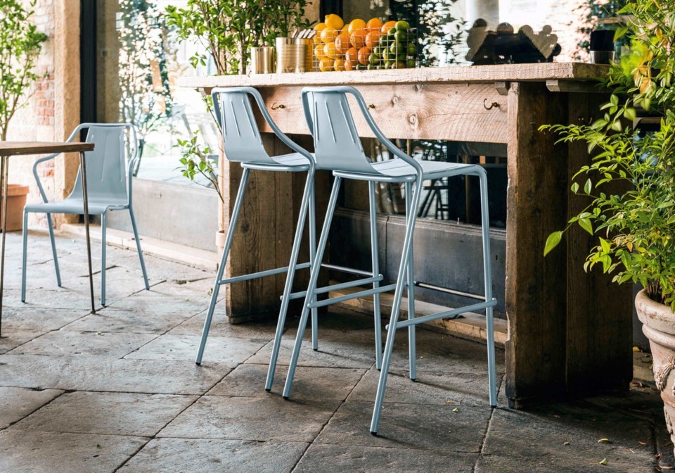 Stool with painted steel structure and seat and back in Tuscan hide or hide, suitable for outdoor use.
