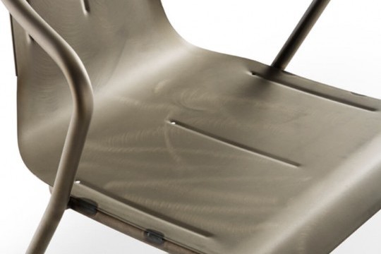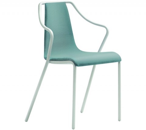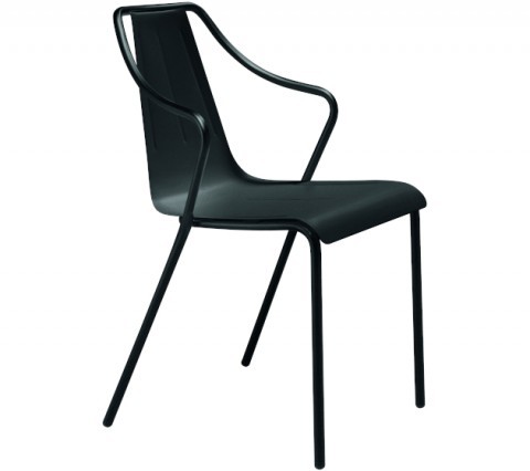 Ola chair with armrests, with structure in lacquered steel and shell upholstered in hide or regenerated hide, suitable for outdoor use.