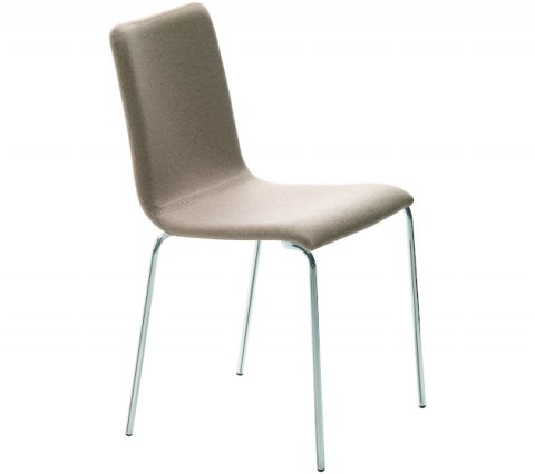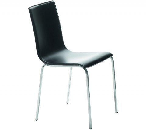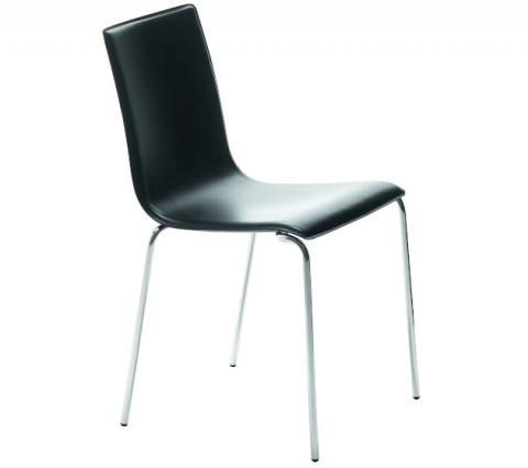 Stakable chair with four square leg frame in chrome or lacquered steel. Shell upholstered in hide or regenerated hide.